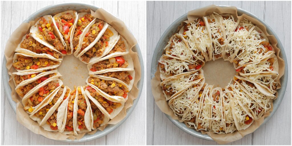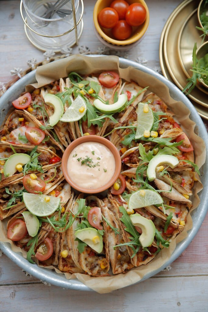 Er is altijd wel tijd om te genieten van deze makkelijke tortilla’s! Ze zijn zo gemaakt en volgeladen met gehakt, kaas en meer lekkers! En dat gezellig op een rij, want dat maakt het uitdelen zoveel leuker! Ideaal om te worden geserveerd op je volgende feestje of voetbal-avond! Ze hebben btw. een heerlijke crunch waar we allemaal van houden! Yes, dit gaan we vaker maken!
