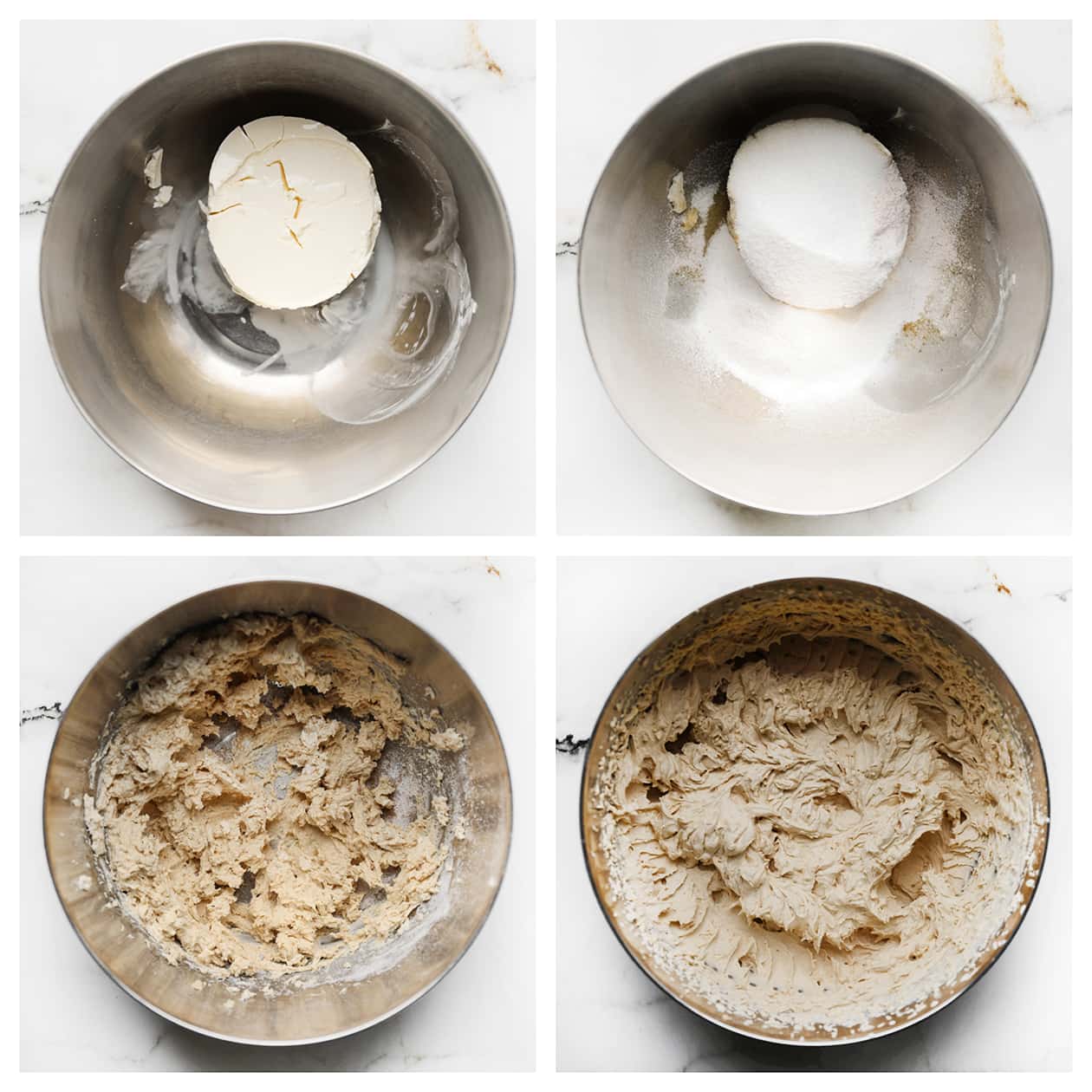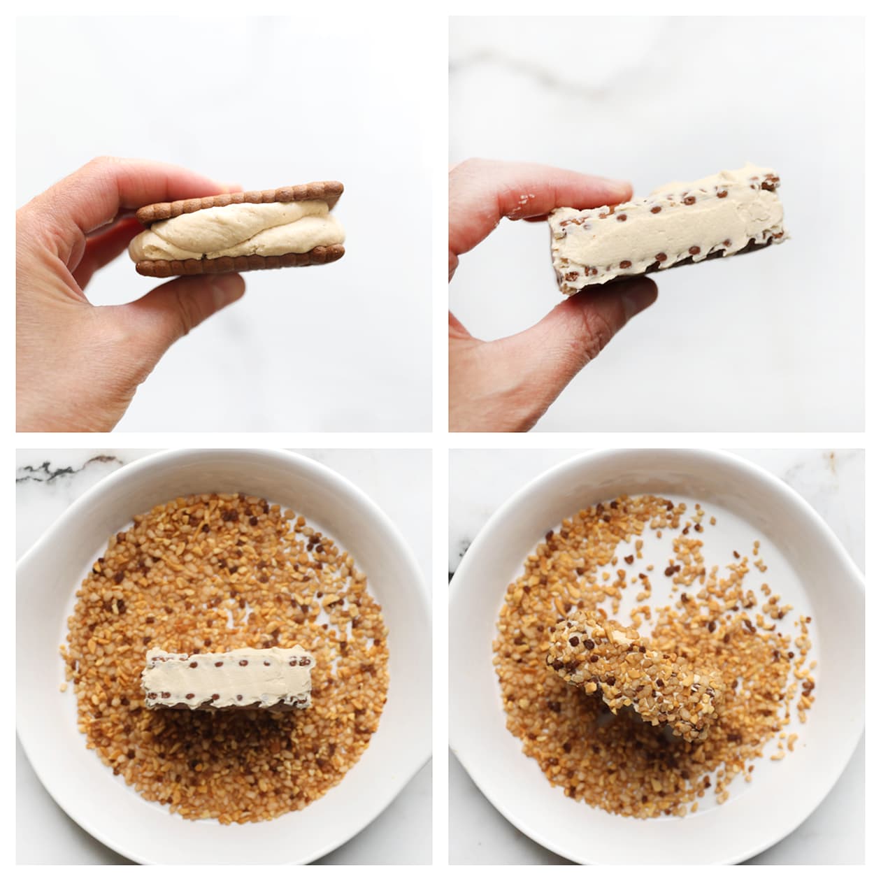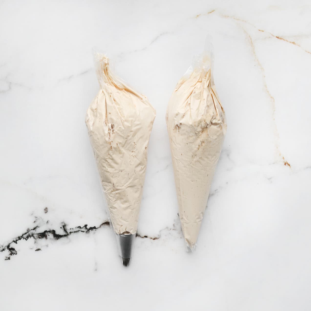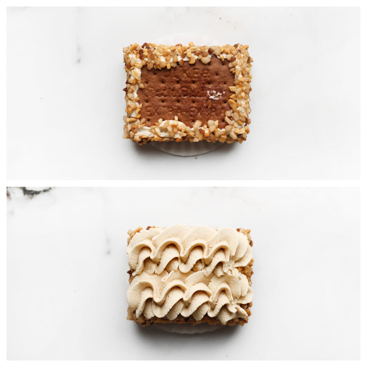 Here’s how you do it: chocolate cookies are spread with caramel, filled with a fluffy mix of coffee, whipped cream, and mascarpone, and then stacked. The sides are coated with cream and covered with nougatine. After chilling for a few hours, they’re good to go.