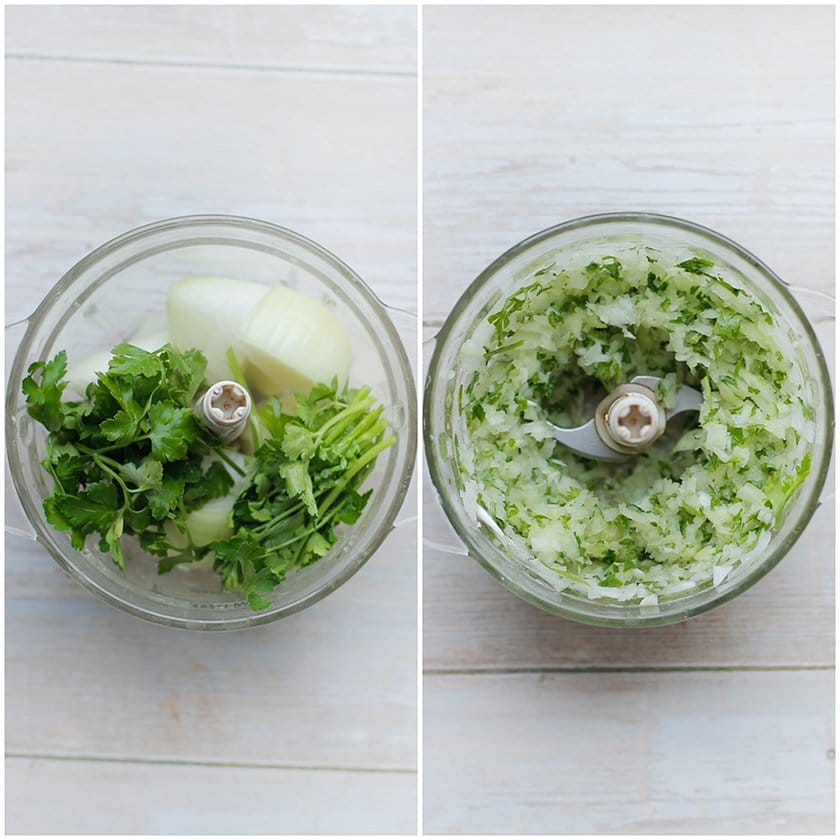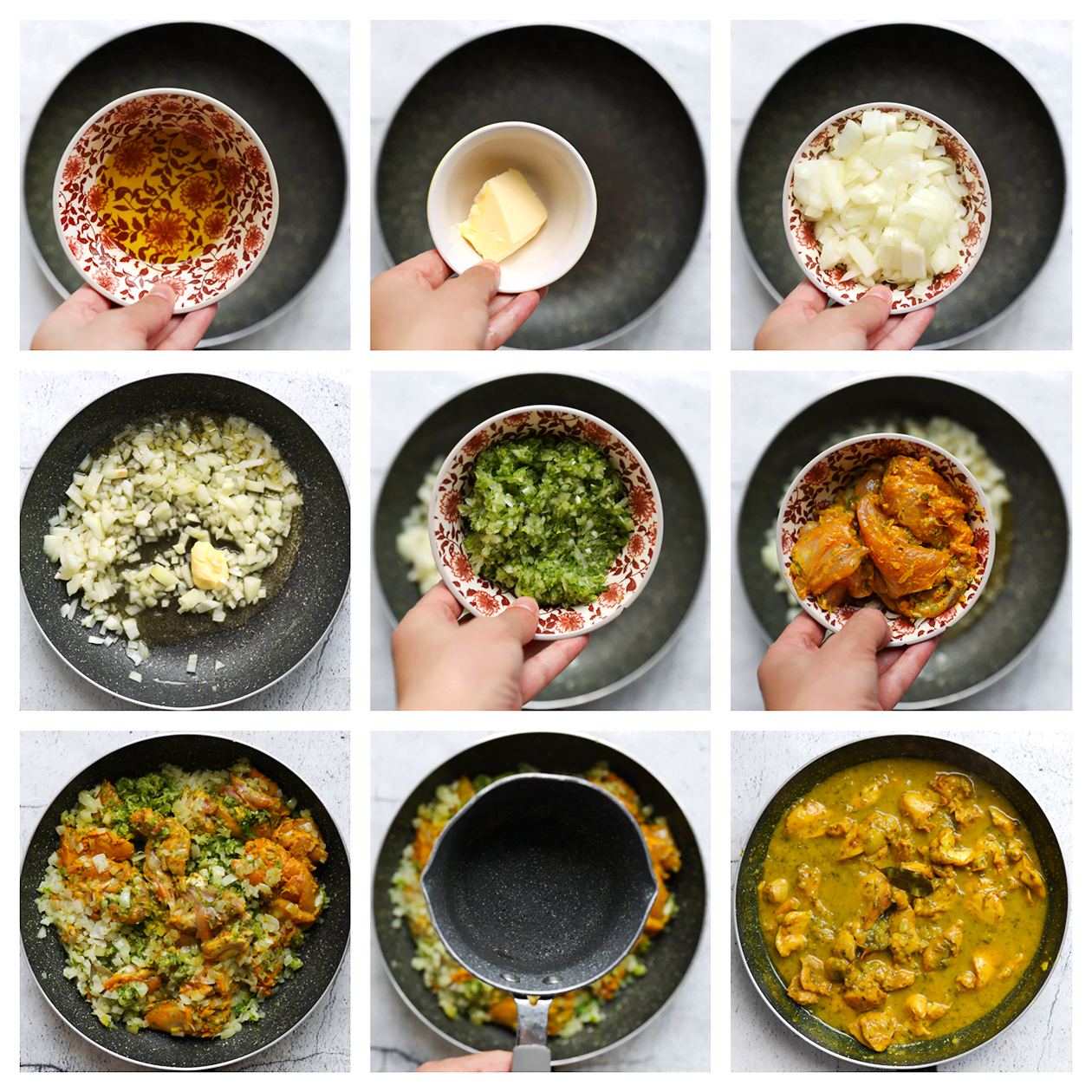 Heat the olive oil and butter in a frying pan over medium heat. Add the chopped yellow onion and fry for 3 minutes. Add the chicken mixture, the remaining vegetable mixture and the bay leaves. Mix well and fry for 4 minutes. Add the bay leaves and water. Increase the heat and bring to a boil. Once boiling, reduce heat and simmer, covered, for 25-30 minutes. Remove the lid and increase the heat. Let the sauce thicken for about 5 minutes. |