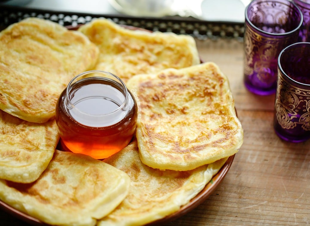 Leg de msemen op de hete gietijzeren pan (anaghdam) en bak voor zo’n 30 seconden aan één kant. Draai de msmen om. Bak de msmen voor één tot anderhalve minuut. Maak telkens een draaibeweging met je handen zodat de msemen egaal goudbruin kleurt. Draai de msmen weer om en bak voor een minuut of tot het gaar is. Herhaal de werkwijze.