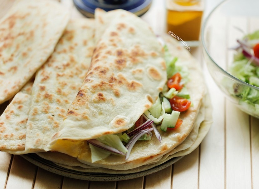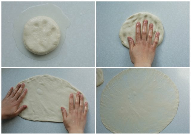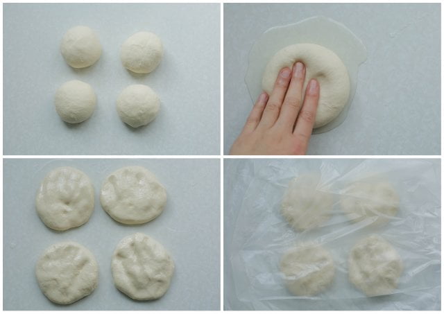 Verdeel het deeg in 4 stukken (160 gram per portie). Vorm er bollen van. Vet de werkplek in met zonnebloemolie (25 ml) en leg het deeg erop. Vet de handen goed in en druk de bol wat plat (12 bij 12 cm). Dek af en laat staan voor 10-15 minuten.