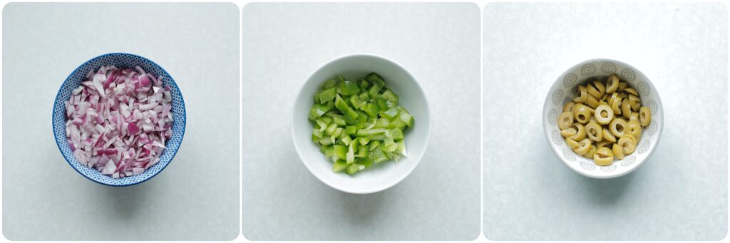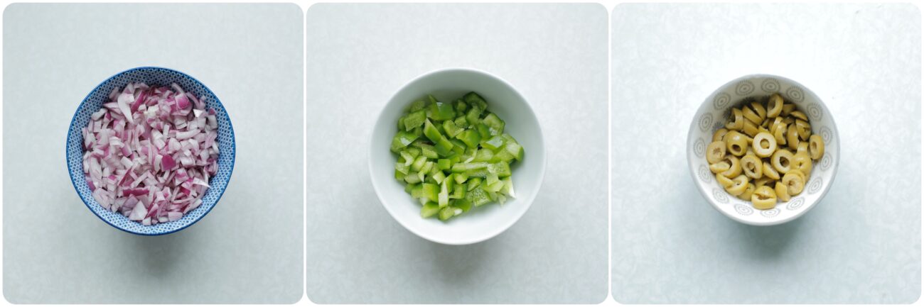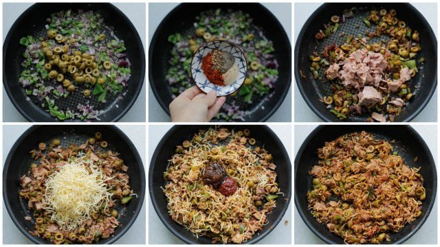 Verhit de olijfolie in een pan op middelhoog vuur. Voeg de ui en paprika toe en bak voor 3-4 minuten of tot de groentes zacht zijn. Voeg de zwarte peper, paprikapoeder knoflookpoeder en Italiaanse mix toe. Roerbak een minuut. Voeg de tonijn en olijven toe. Bak voor een minuut. Zet het vuur uit. Voeg de geraspte kaas, sambal en currysaus toe. Meng goed. Laat compleet afkoelen.
