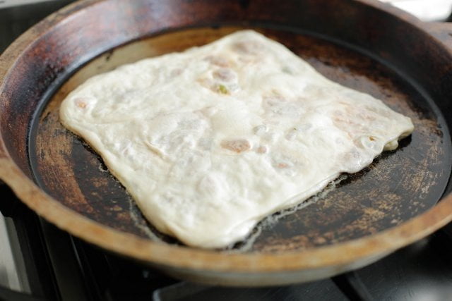 Verhit de ingevette gietijzeren pan (anaghdam) op middelhoog vuur tot het behoorlijk heet is. Leg wat griesmeel samen met wat olie op de werkplek en smeer uit. Neem een gevouwen msmen met tonijn en lig dit erop. Veeg met je vingertoppen het uiteinde plat om het formaat te verdubbelen (20 bij 18 cm).