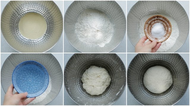 Doe de griesmeel samen met de bloem, het zout en water in een diepe kom. Kneed alle ingrediënten samen voor een paar minuten en laat even staan voor 5 minuten. Kneed voor een paar minuten tot een samenhangend deeg. Dek af en laat 10 minuten staan.