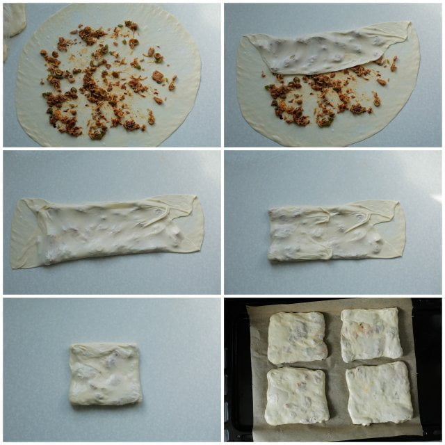 Verdeel het tonijnmengsel (110 gr per msmen) over het deeg. Vouw het flinterdunne deeg naar binnen in vier delen, de zijkanten, bovenkant en onderkant. Vorm het tot een vierkante pakket van 14 bij 14 cm. Herhaal deze stap met de rest.