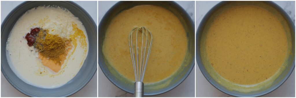 Ontvel de tomaat en haal de zaadjes weg. Snijd de tomaat klein. Pel en hak de rode ui fijn. |