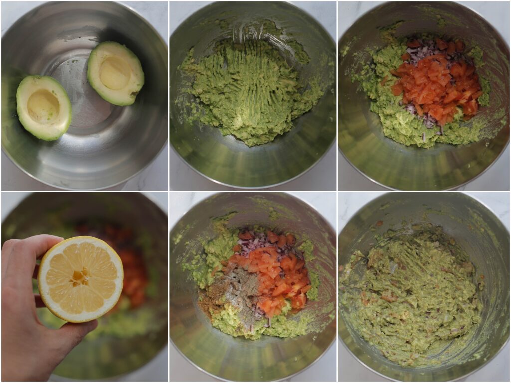 Snijd de avocado doormidden en verwijder de pit. Schep met een lepel het vruchtvlees eruit en doe dit in een diepe kom. Prak de avocado niet al te fijn. Voeg de tomaat, rode ui, citroensap, komijn en zwarte peper toe. Prak samen tot een geheel. Voeg zout toe naar eigen smaak (ik heb 1,5 gram gebruikt). |