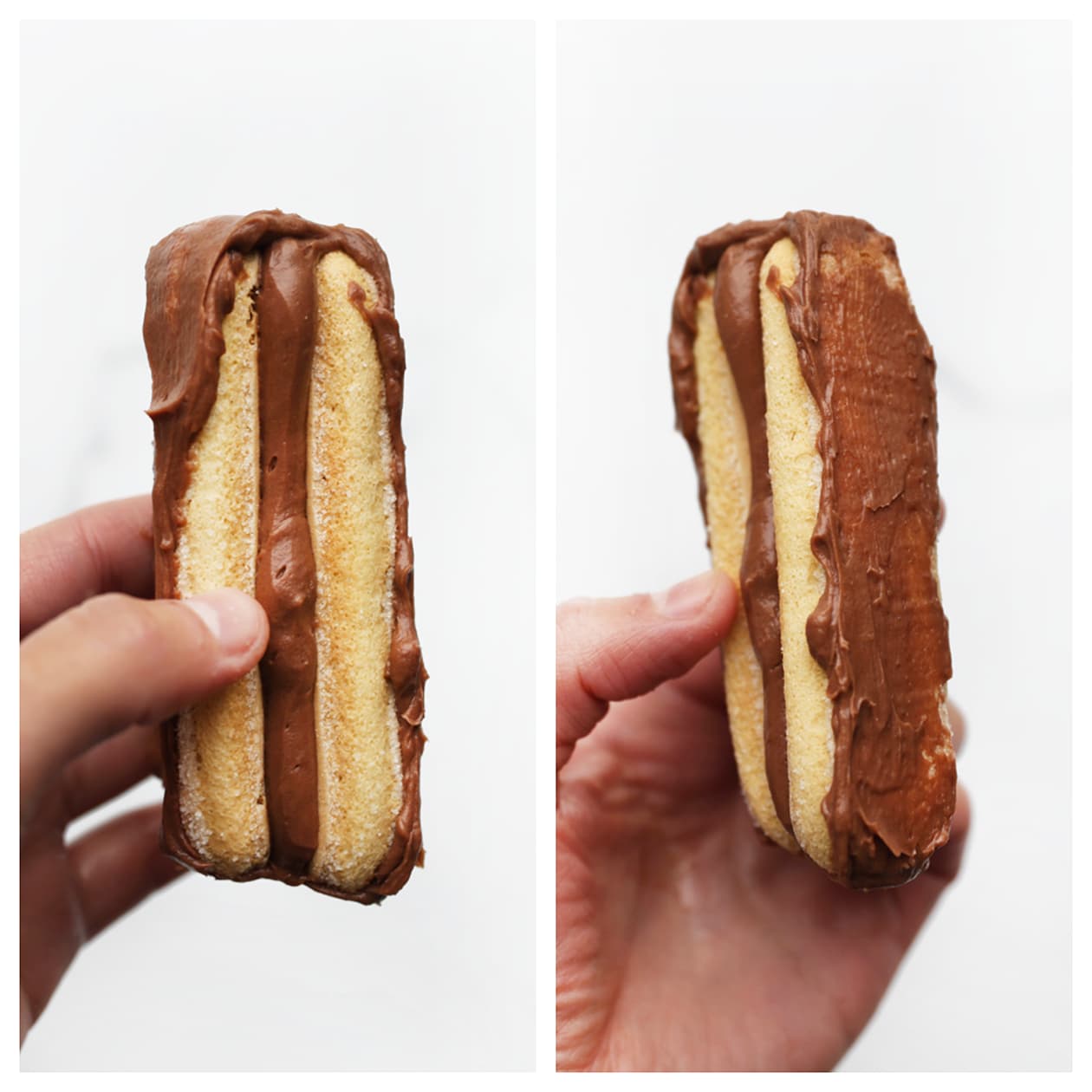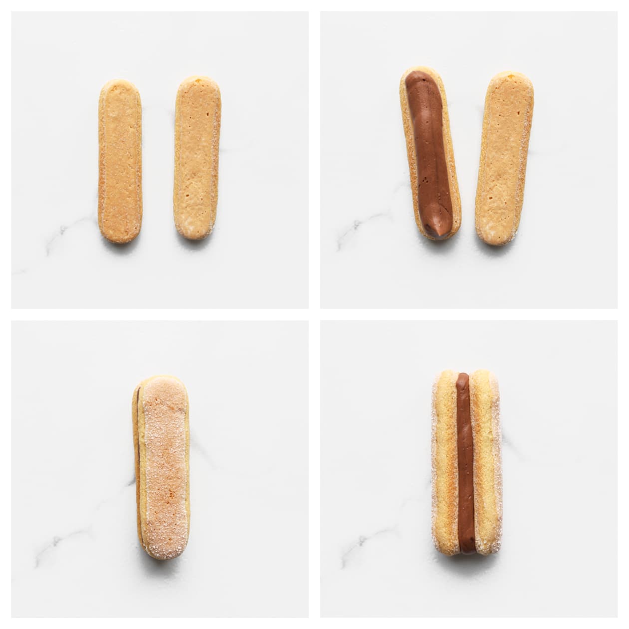 Take a ladyfinger and pipe a dollop of cream on it. Place another ladyfinger on top and press firmly.