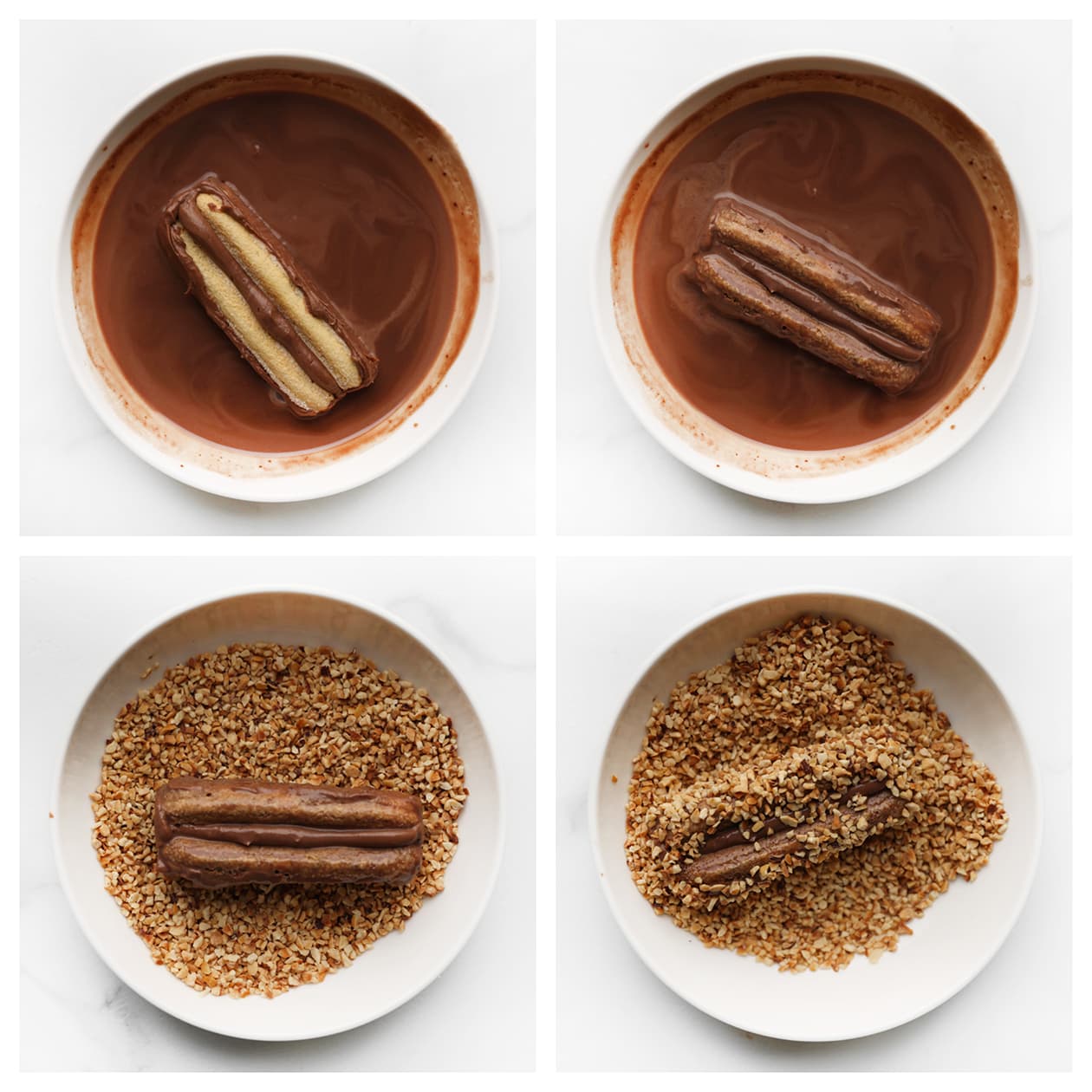 Briefly dip in the chocolate mixture. Then coat the sides with the finely chopped hazelnuts.