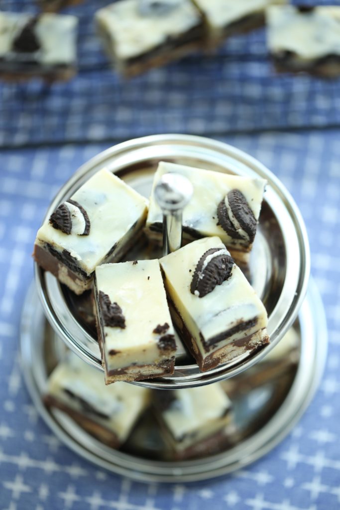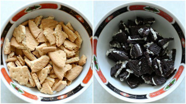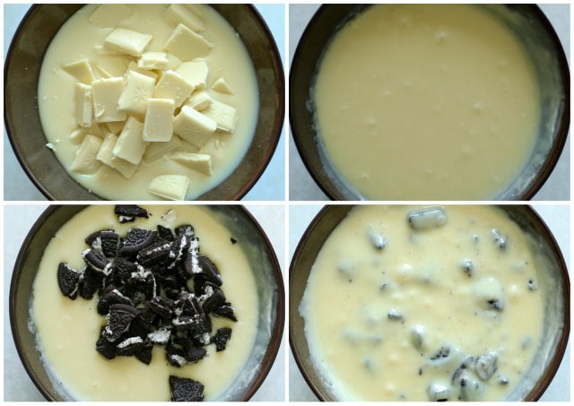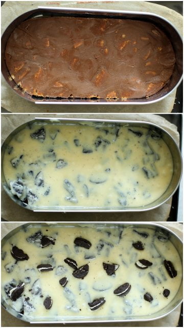 Verdeel het donkere chocolademengsel over de bakvorm. Vergeet niet om er een vel bakpapier op de bodem te leggen. Druk het mengsel goed en stevig aan. Als het mooi egaal is, verdeel je het witte chocolademengsel over het donkere chocolademengsel. Maak het af met stukjes oreo. Leg het afgedekt in de koelkast en laat het voor een paar uur opstijven in de koelkast. |