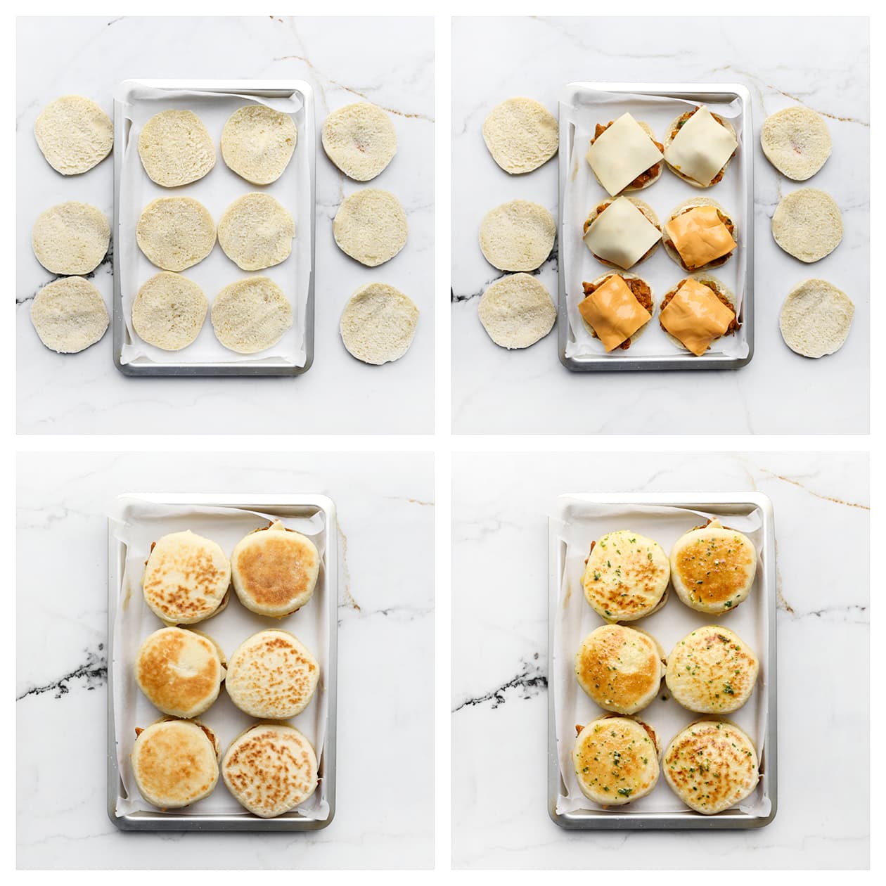 Snijd de broodjes doormidden en leg ze op een met bakpapier beklede bakplaat. Vul de broodjes met het kipmengsel en, indien gewenst, een plakje kaas. Leg de bovenkant van de broodjes erop en bestrijk ze met het roombotermengsel. Plaats de gevulde broodjes in een voorverwarmde oven op 200 °C en bak tot de kaas mooi is gesmolten. |