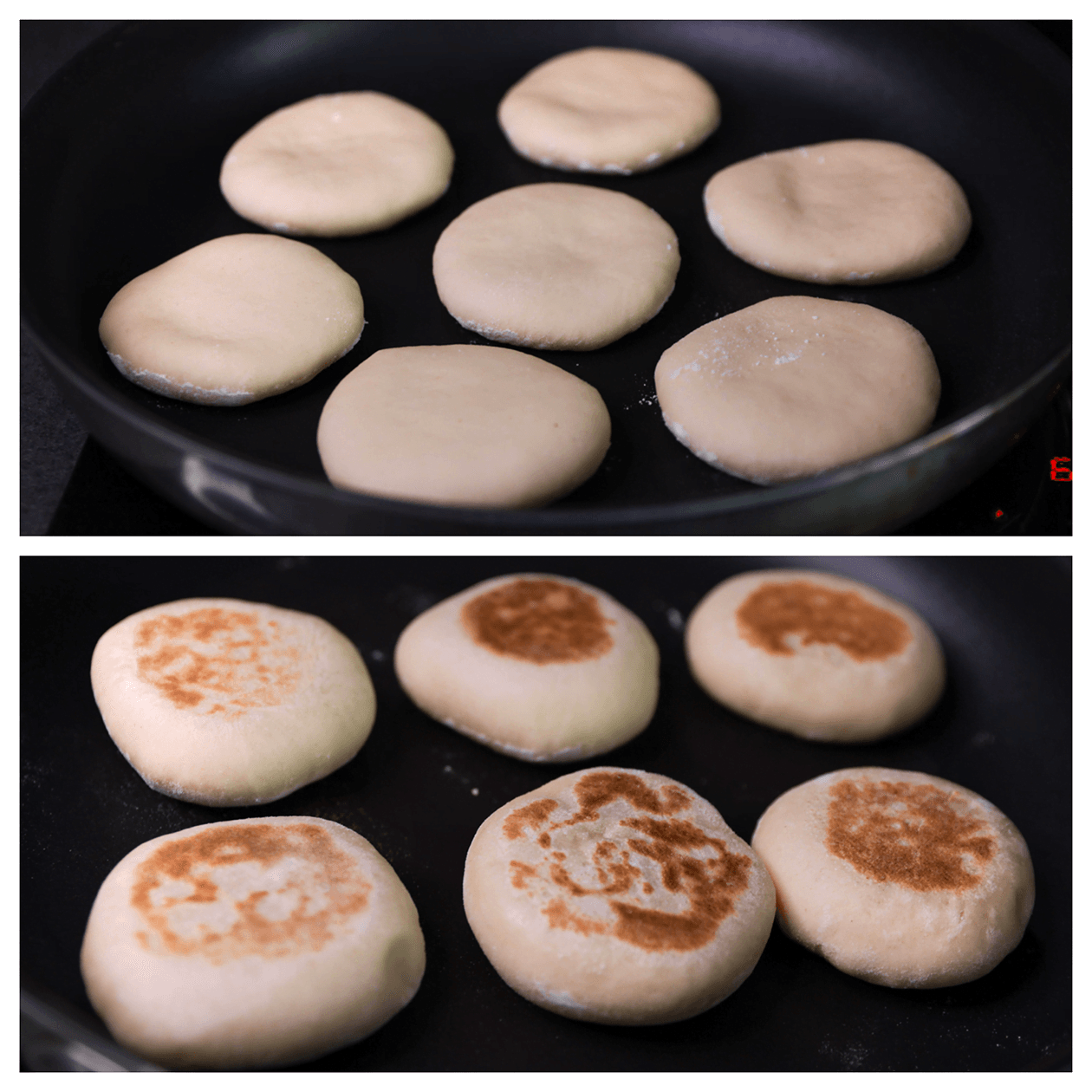Verhit een koekenpan met een dikke bodem op middelhoog vuur. Bak de broodjes aan beide kanten goudbruin en dek ze direct af met een schone theedoek, zodat ze heerlijk zacht blijven.