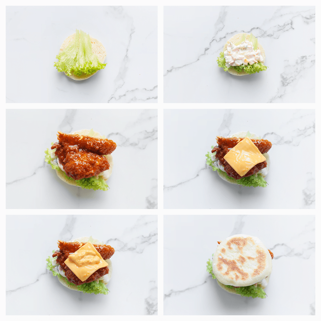 Snijd het broodje horizontaal doormidden. Leg er sla op en verdeel er wat van het groentemengsel op. Leg de kip erop en voeg de cheddar kaas, saus en de bovenkant van het broodje toe.