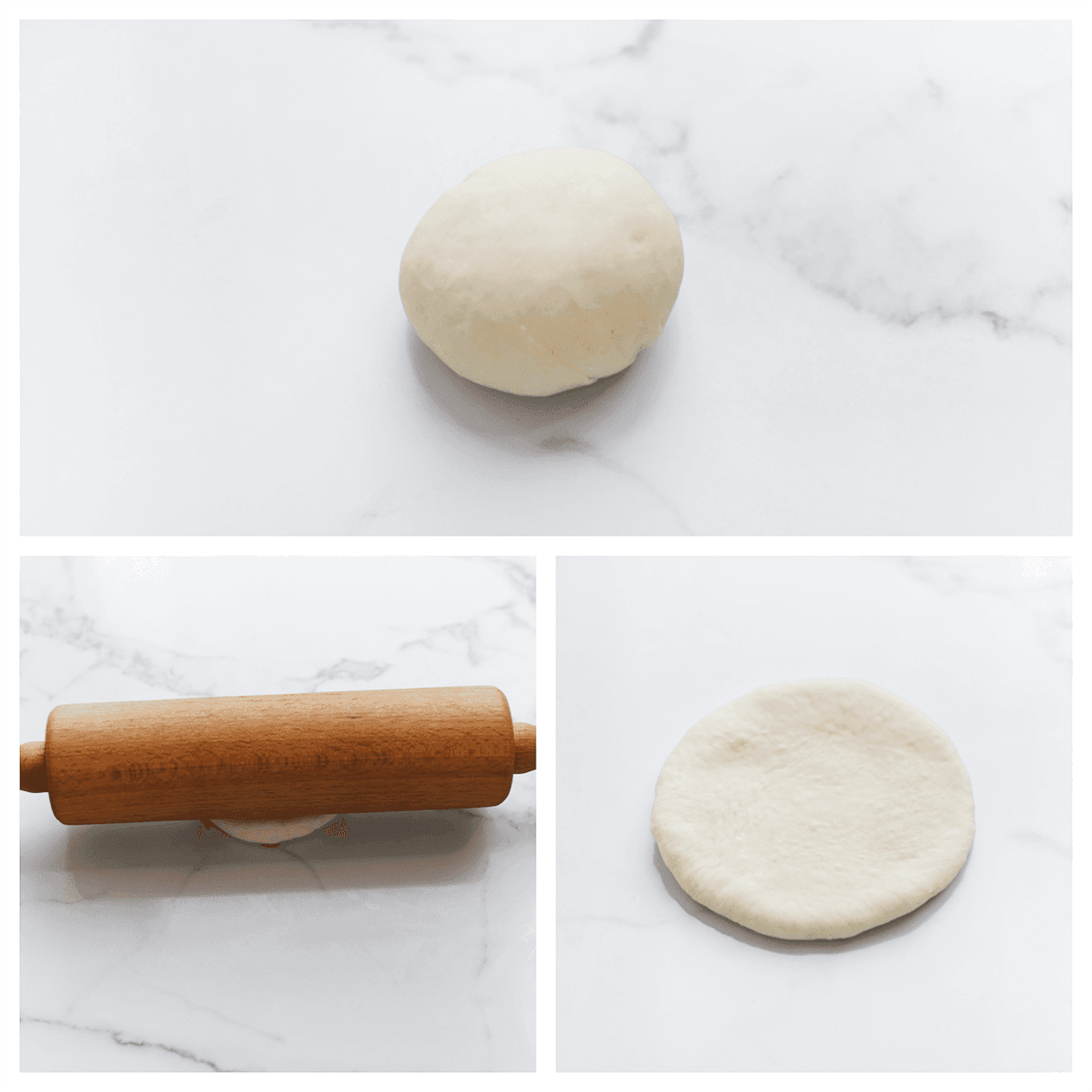 Neem een bolletje deeg en maak deze plat met een deegroller tot een omvang van 7,5 cm.