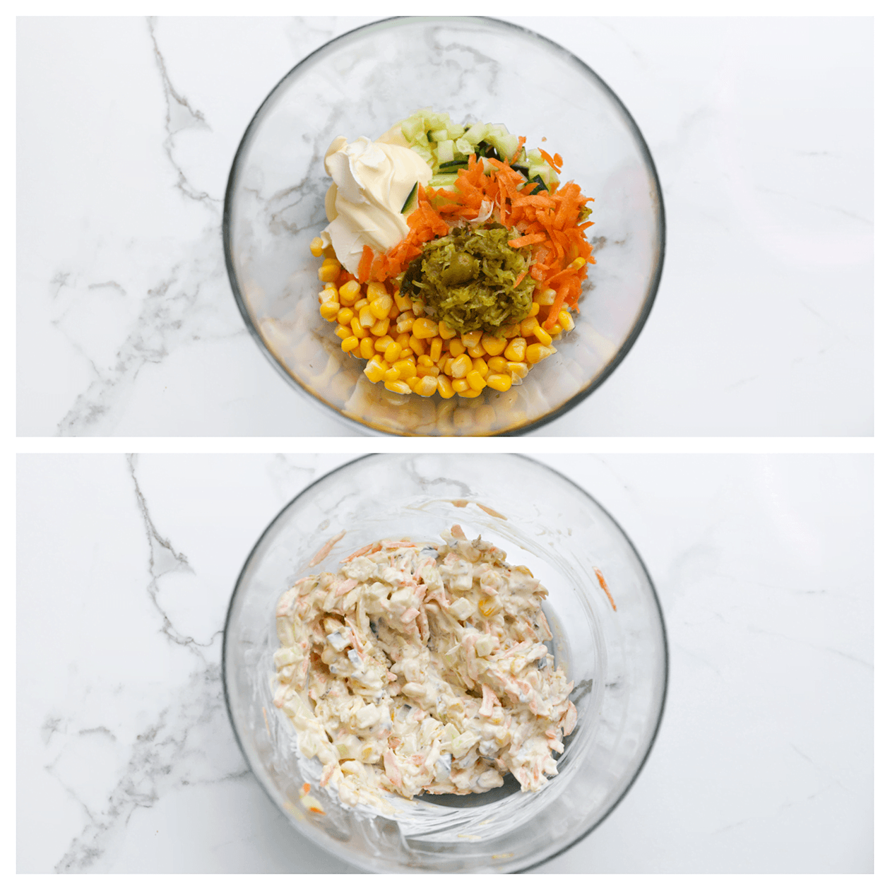 Snijd de komkommer in kleine stukjes. Rasp de wortel, augurk en gele ui. Doe de mayonaise samen met de roomkaas, maïs, komkommer, wortel, gele ui en augurk in een kom. Meng goed.