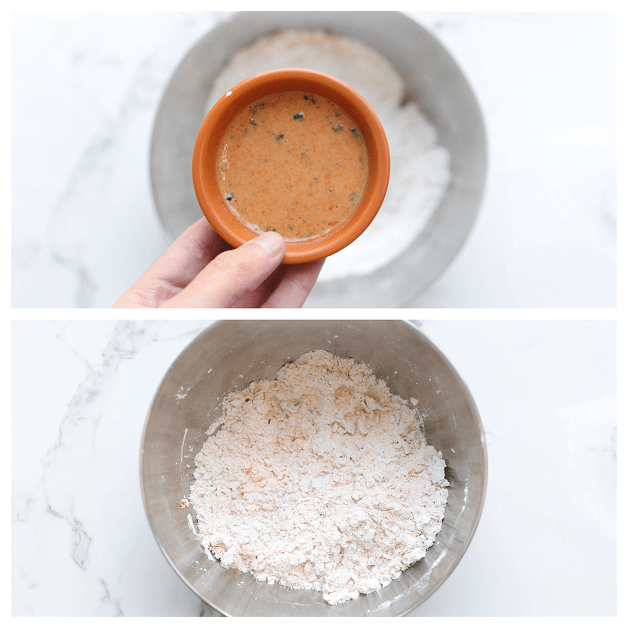 Doe de bloem, maïzena, knoflookpoeder, uienpoeder, cayennepeper, het zout en het karnemelkmengsel in een andere kom. Verkruimel goed samen met je handen.