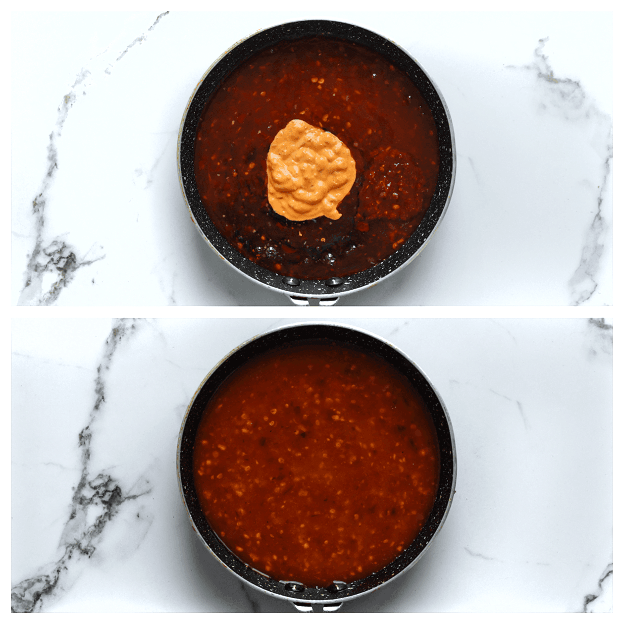 Als je van een sticky coating houdt, kun je de kip door een sticky saus halen (ik heb de helft van de krokante kip door de sticky saus gehaald). Doe de chilisaus, honing, samurai saus en sambal in een steelpan. Kook op niet al te hoog vuur tot een geheel.