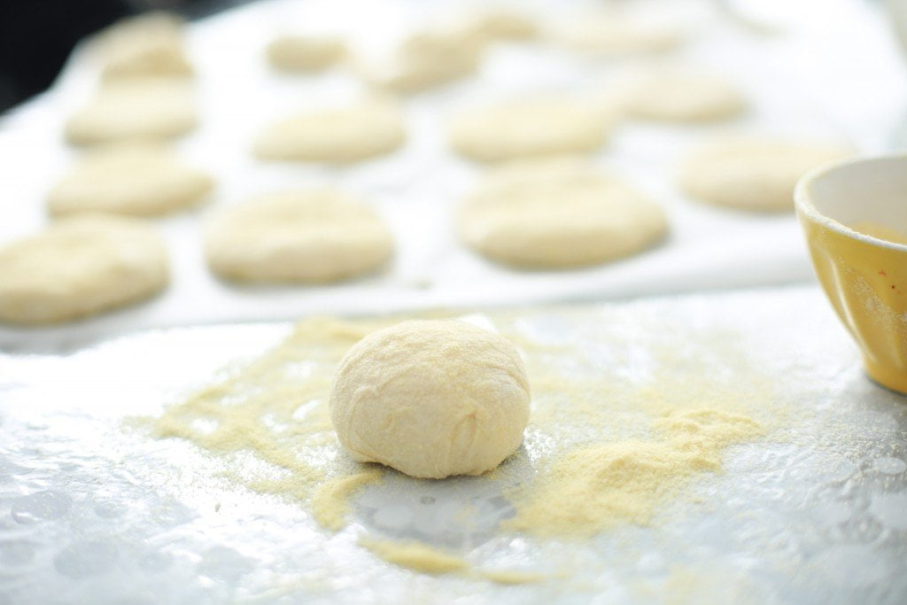 Strooi wat bloem en griesmeel op je werkplek, verdeel het deeg in 10/12 bollen. Druk de bol plat en vorm tot een ovaal. Leg het op een bakplaat bedekt met bakpapier (6 per keer).
