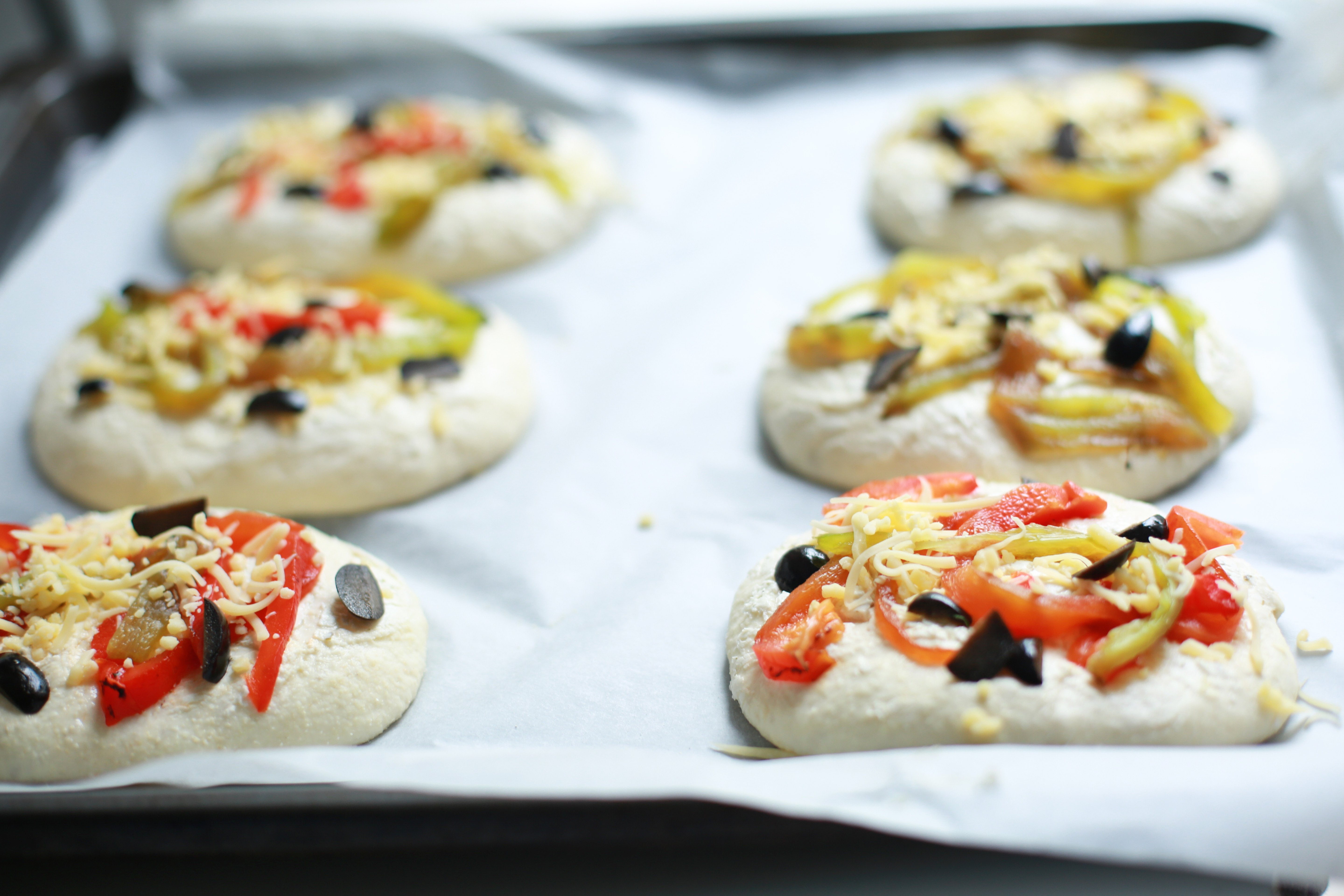 Bestrijk het deeg met knoflook kruiden roomkaas, strooi er wat paprika en geraspte kaas op. Laat een half uur rijzen op een warme plek.