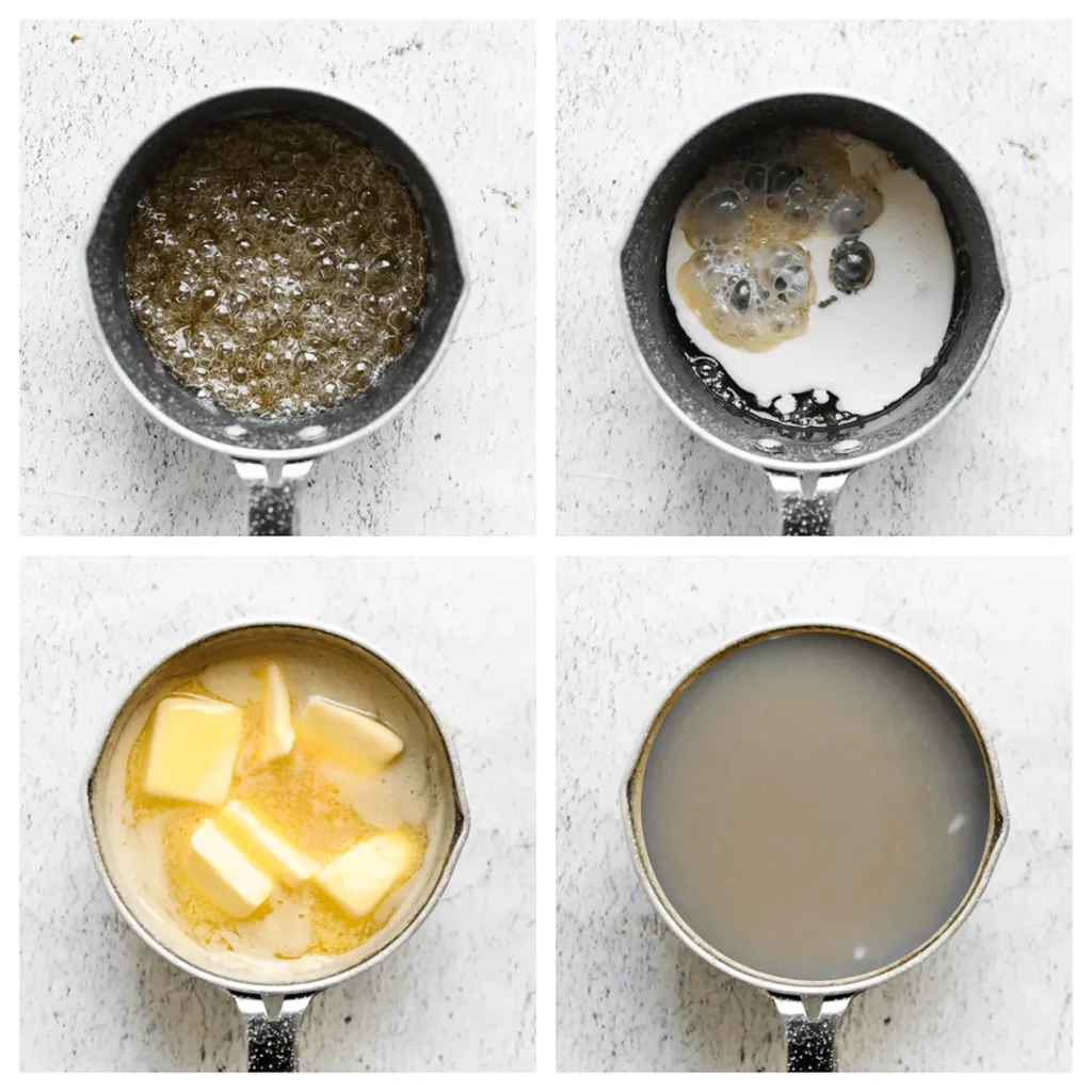 Verhit de steelpan op middelhoog vuur. Voeg water en suiker toe en meng goed. Kook tot het suikermengsel goudbruin begint te kleuren. Voeg ong |