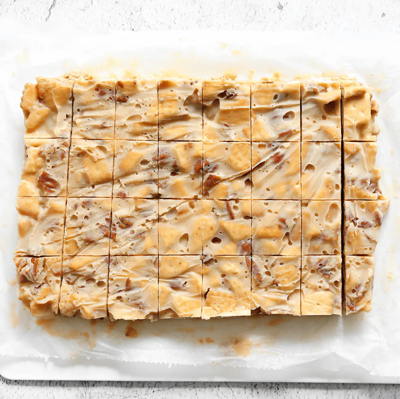 Snijd de pecan-karamelkoekjes gelijkmatig: Als je de koekjes in gelijke blokjes wilt snijden, kan het handig zijn om een scherp mes te gebruiken en vanuit het midden te beginnen voor een gelijkmatig resultaat.