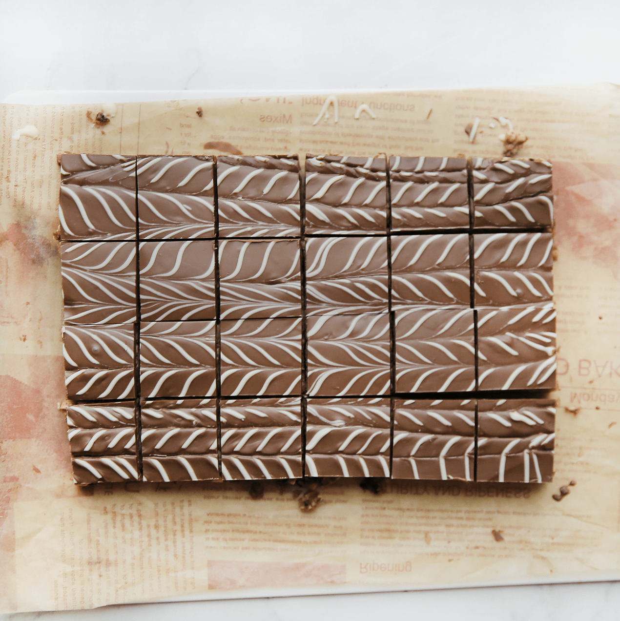 Smelt 150 gram melkchocolade au bain-marie. Giet de melkchocolade over het pinda-mengsel en laat het gelijkmatig uitvloeien. Leg 30 minuten in de koelkast of tot de melkchocolade goed stevig is.