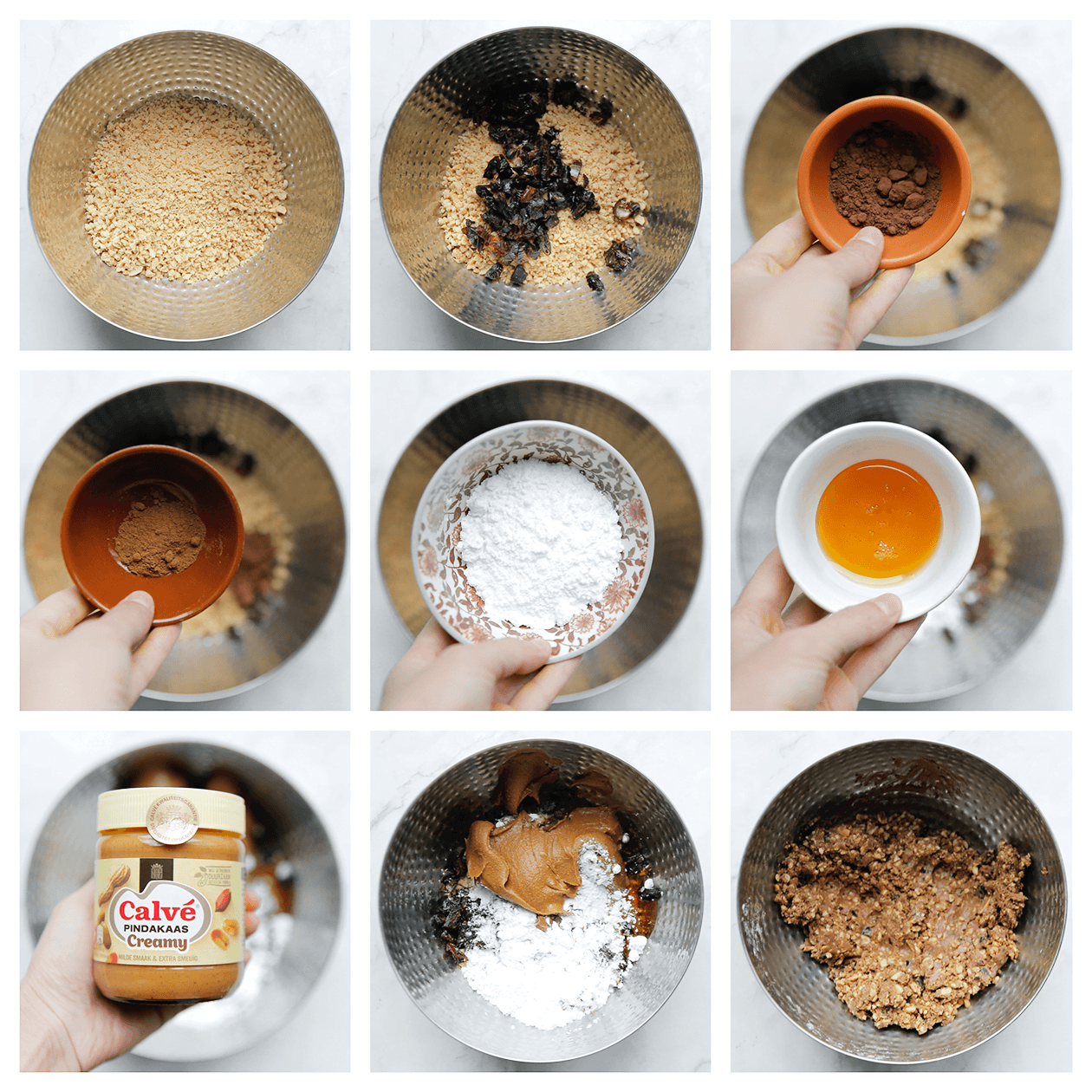 Doe de gemalen pinda’s in een diepe kom. Voeg de poedersuiker, honing, kaneelpoeder, cacaopoeder, Calvé Creamy Pindakaas en dadels toe. Meng goed. Verdeel het pinda-mengsel over de bakvorm en druk plat.