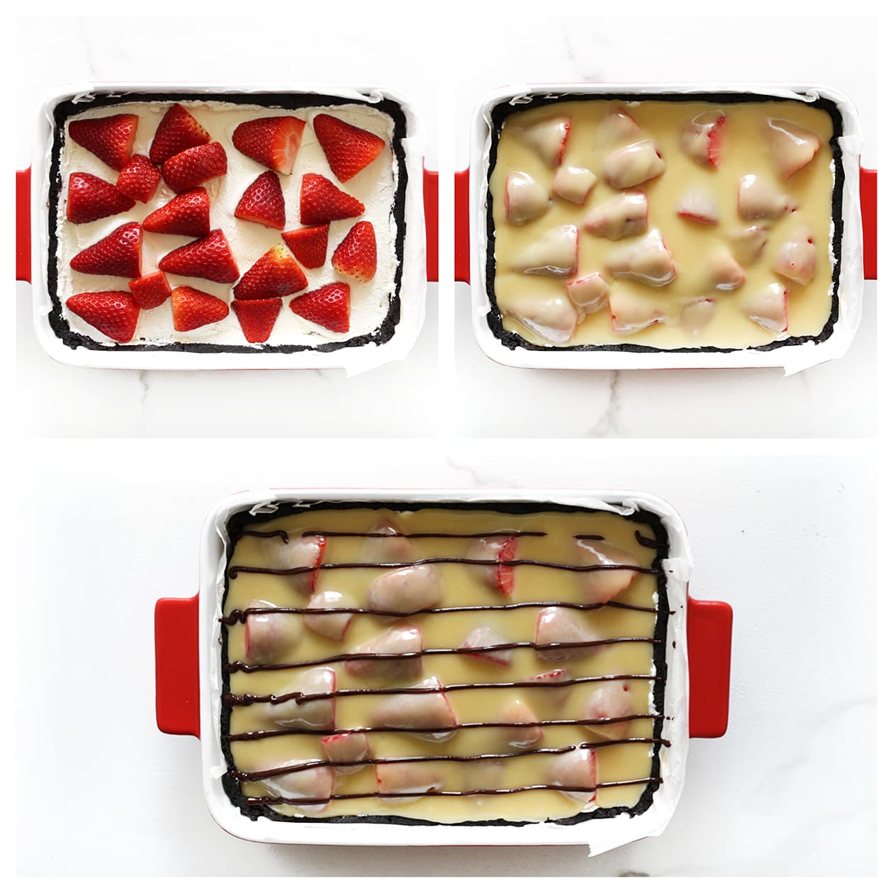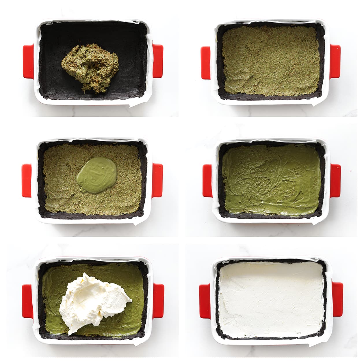 Laat de bodem minstens 15-20 minuten in de koelkast opstijven voordat je de volgende laag toevoegt.