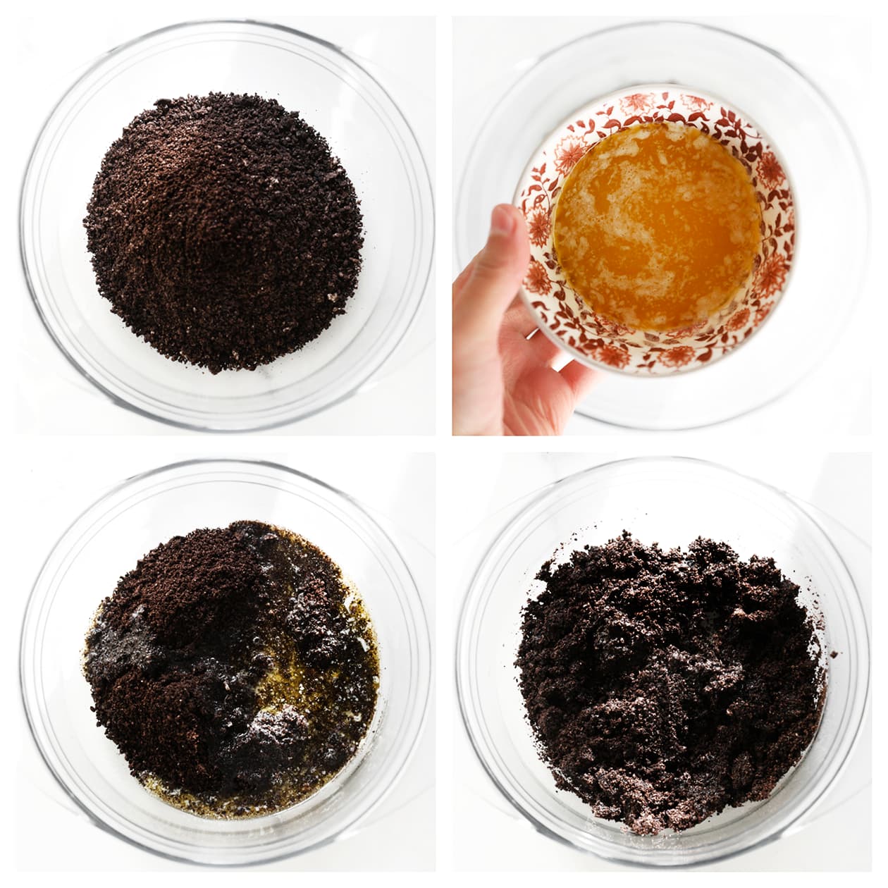 Hoe fijner de koekjes, hoe steviger en gelijkmatiger de bodem wordt. Als je een iets grovere structuur wilt, laat dan een paar stukjes grover.