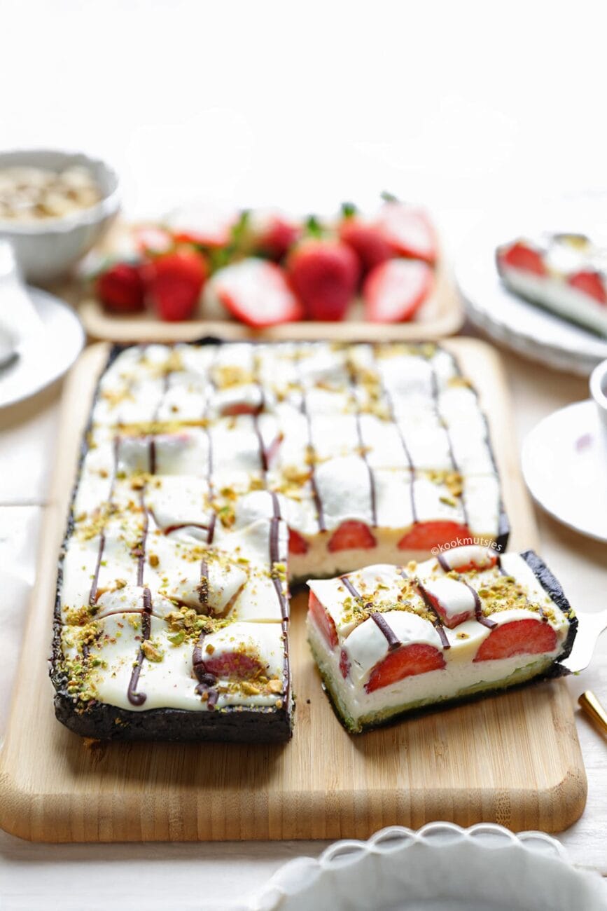 Als je op zoek bent naar een lekker en indrukwekkend dessert zonder al te veel gedoe, dan moet je dit proberen! Een stevige chocoladebodem, knapperige pistachevulling en frisse aardbeien met room, allemaal overgoten met een zijdezachte witte chocolade ganache. Perfect voor een feestje, als traktatie of gewoon omdat je zin hebt in iets heerlijks!