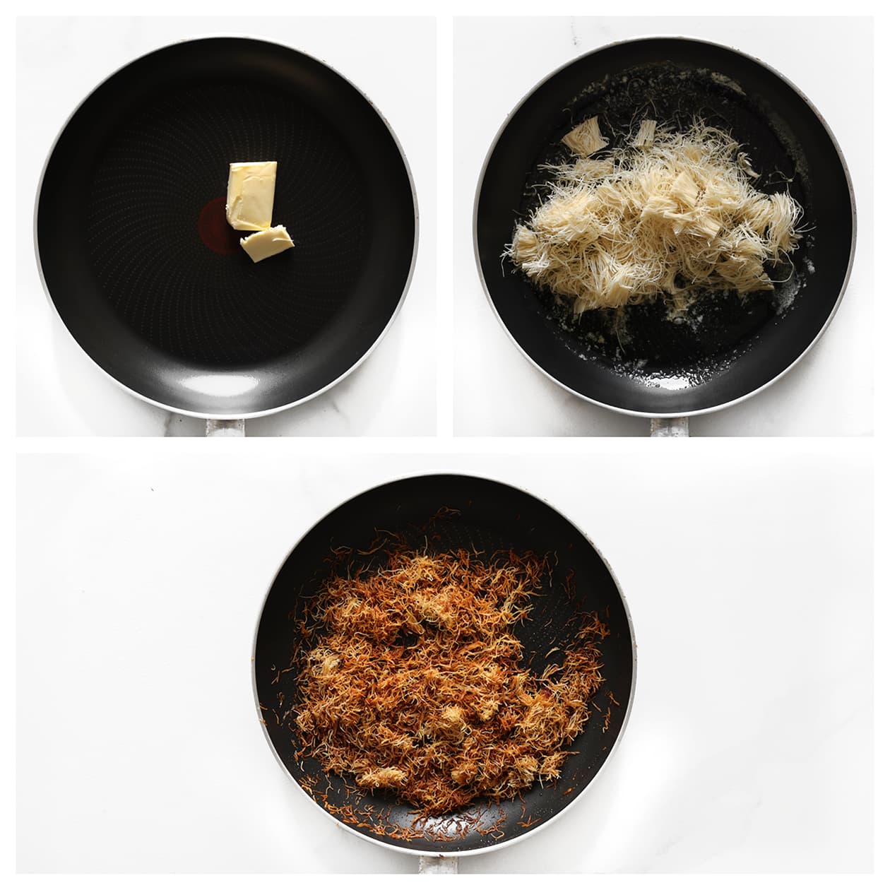 Roer de kataifi regelmatig tijdens het bakken, zodat deze gelijkmatig goudbruin wordt en niet verbrandt.