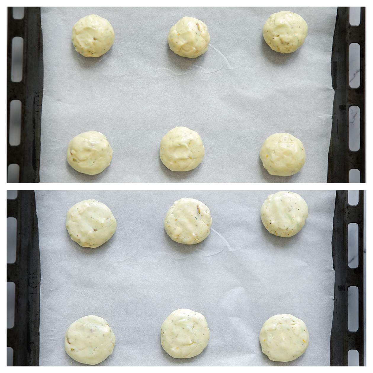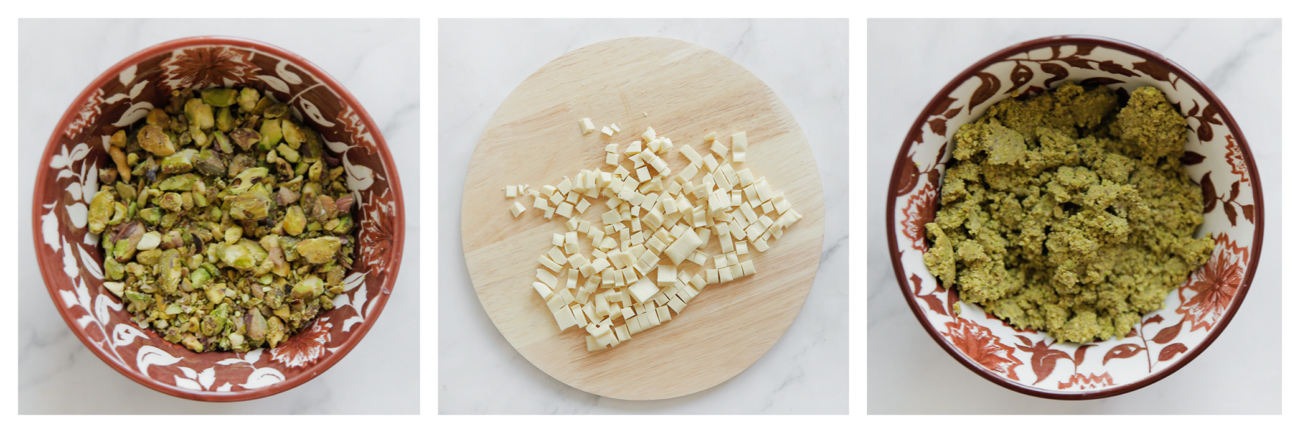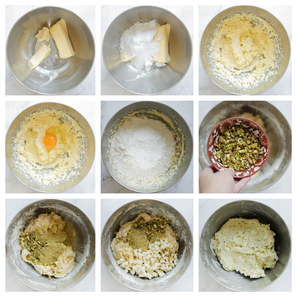 Doe de roomboter samen met de witte basterdsuiker en vanillesuiker in een diepe kom. Mix tot een glad geheel. Voeg het ei toe en mix goed. Voeg de bloem en het bakpoeder toe. Meng en kneed tot een mooie koekjesdeeg. Voeg de witte chocolade en gehakte pistache toe. Meng goed. Leg, afgedekt, in de koelkast zodat het stevig wordt. Je kunt het ook even in de vriezer leggen om het proces te versnellen. |