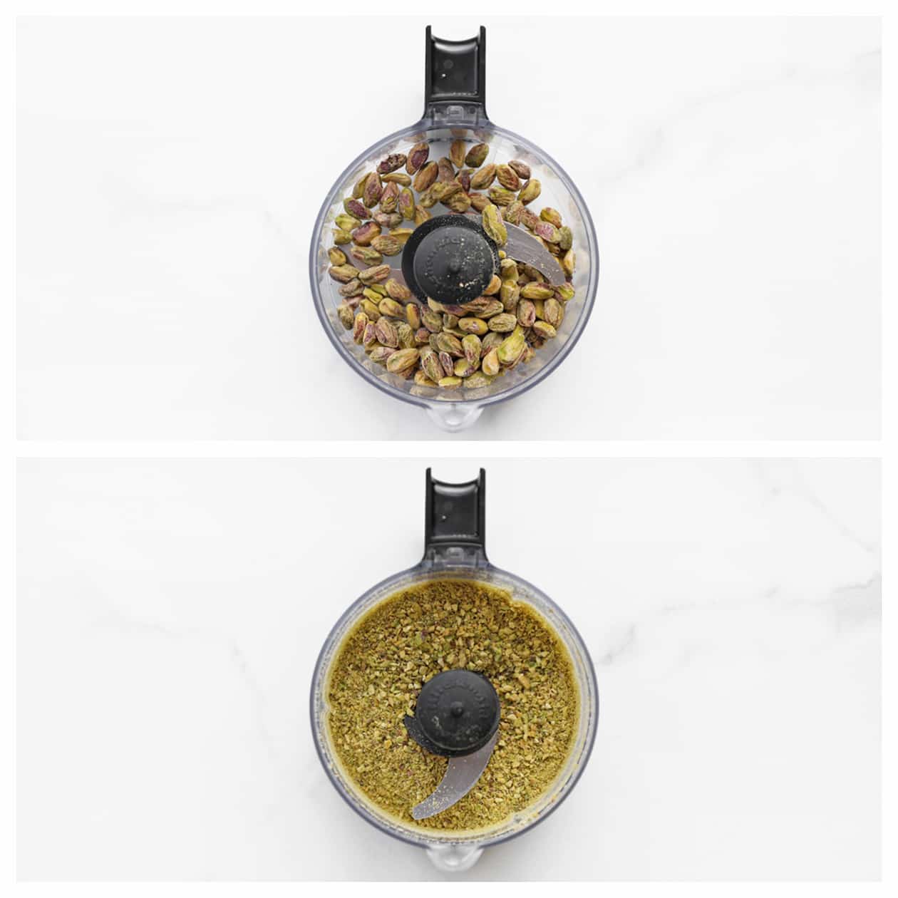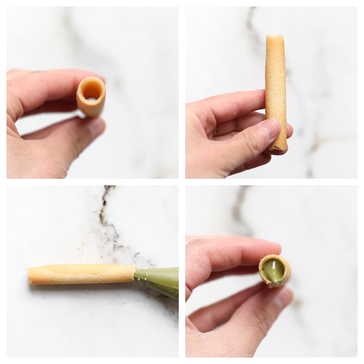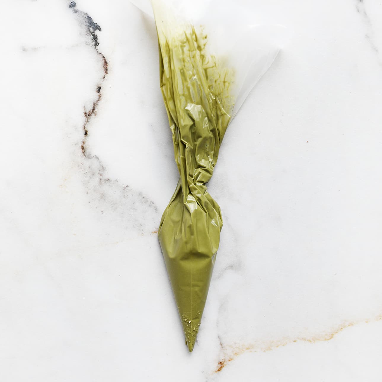 Warm the pistachio paste so it becomes more fluid and easier to pipe.