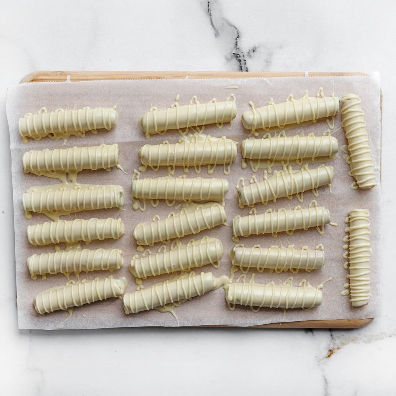 Place the cookies on a sheet of baking paper to prevent sticking. This makes it easier to pick them up without damaging the chocolate.
