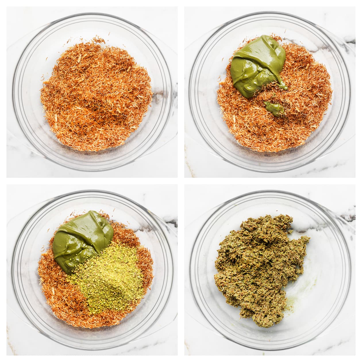 Ensure the kataifi turns a deep golden brown before mixing it with the pistachio paste. This gives a crunchy bite and a richer flavor. Stir continuously while frying to prevent burning.