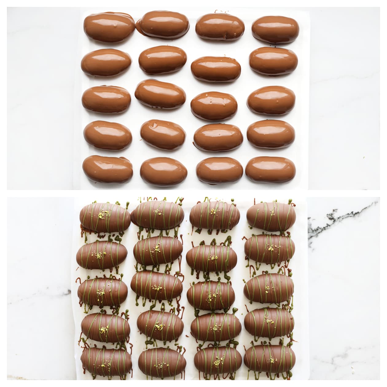 Use a piping bag or a small plastic bag with a snipped-off tip to create neat, thin lines of chocolate or pistachio paste on the cookies.
