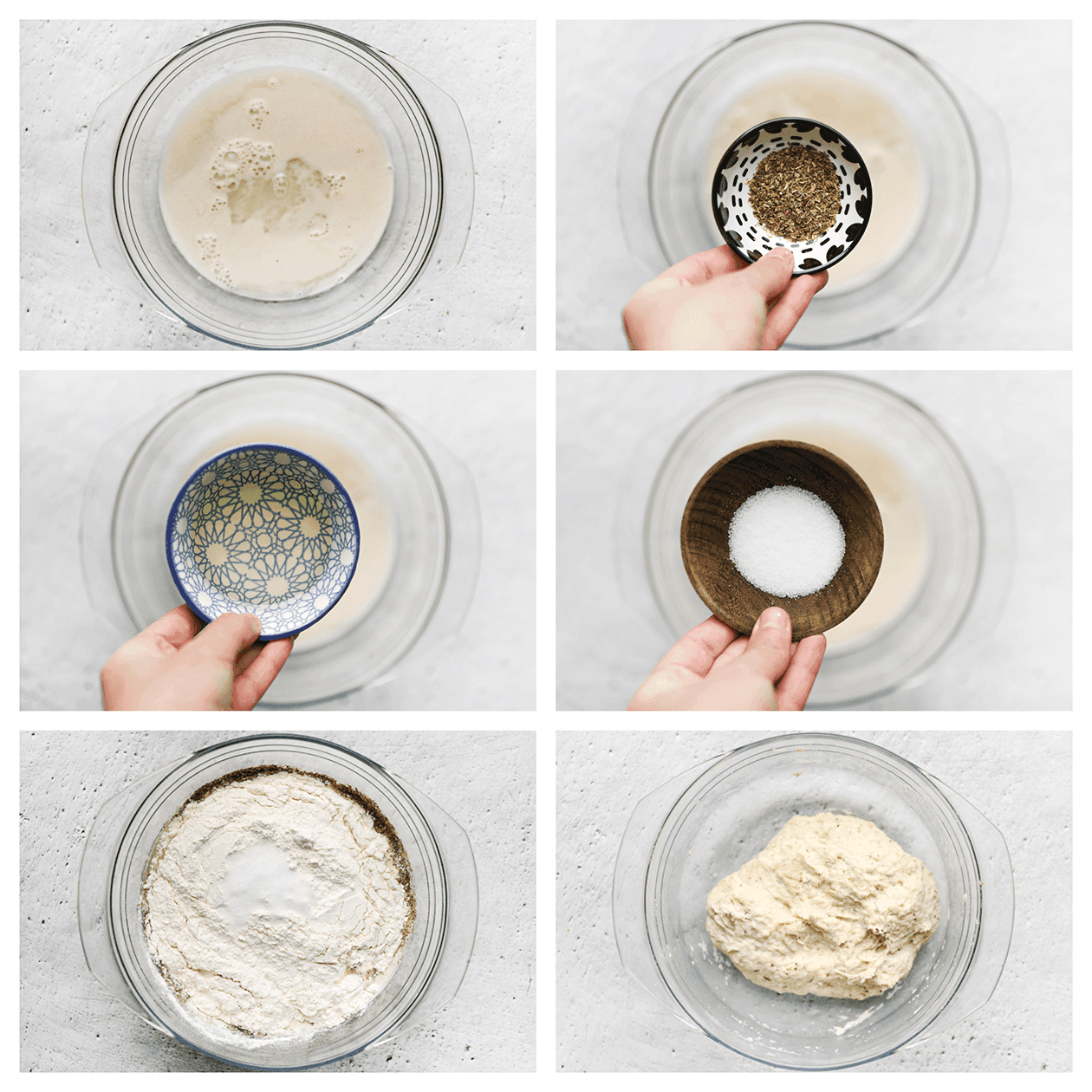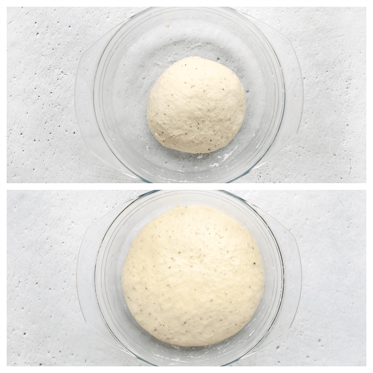 Voeg de zonnebloemolie, Italiaanse kruiden, bloem en het zout toe. Kneed het deeg gedurende 10 minuten tot een geheel.