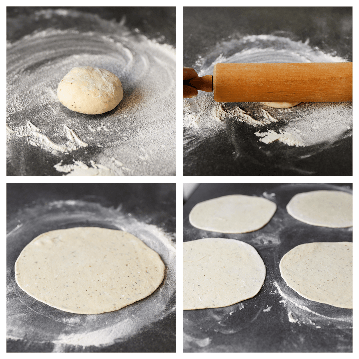 Neem een bolletje deeg en leg deze op een werkplek bestrooid met bloem. Rol het deeg uit tot een ronde dunne lap van 20 cm. Herhaal deze werkwijze.