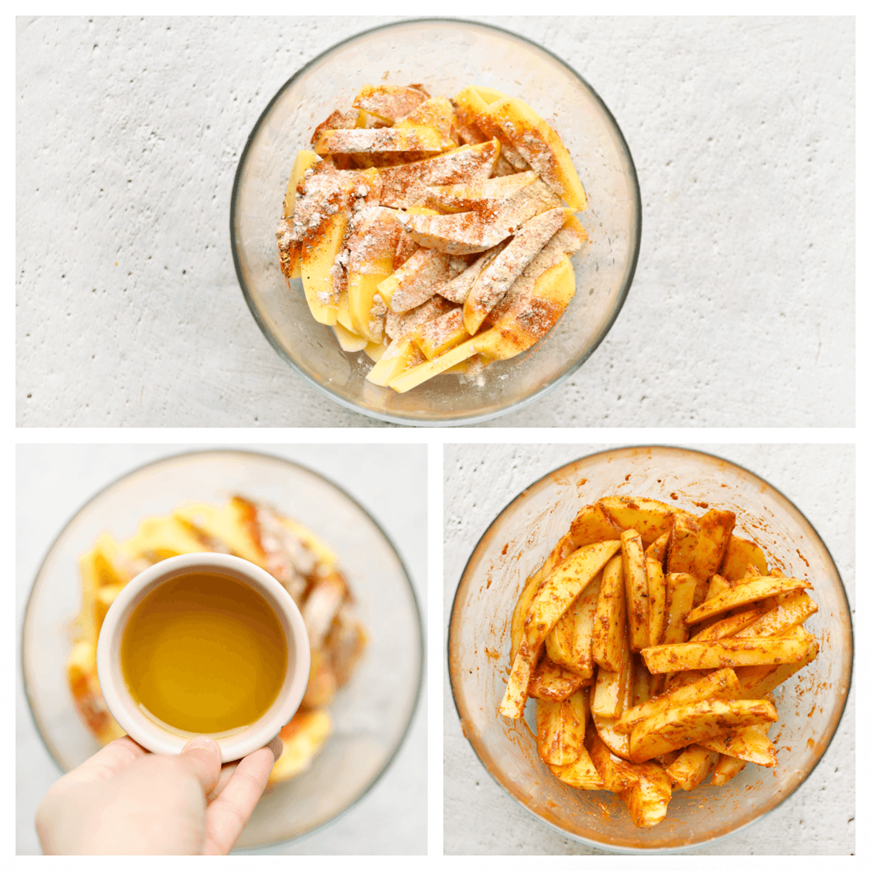Schil en snijd de aardappels in frietjes. Doe ze in een diepe kom samen met de paprikapoeder, kipkruiden, uienpoeder, knoflookpoeder, Italiaanse kruiden en olijfolie. Meng goed.