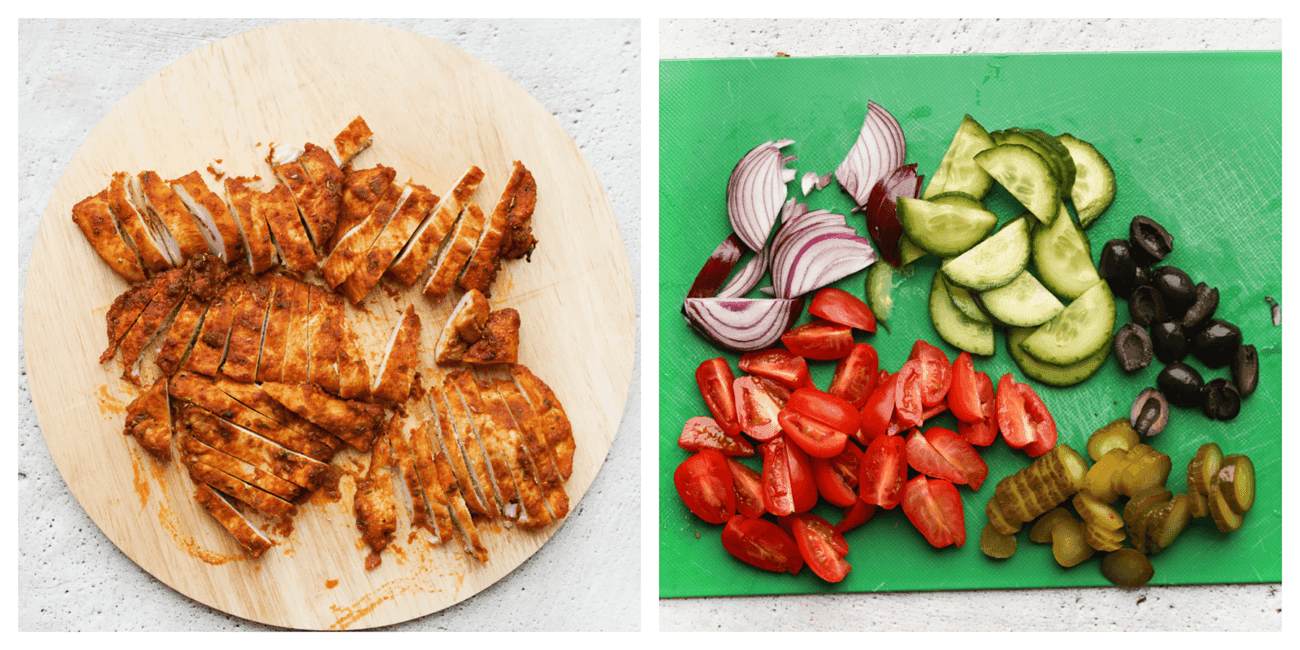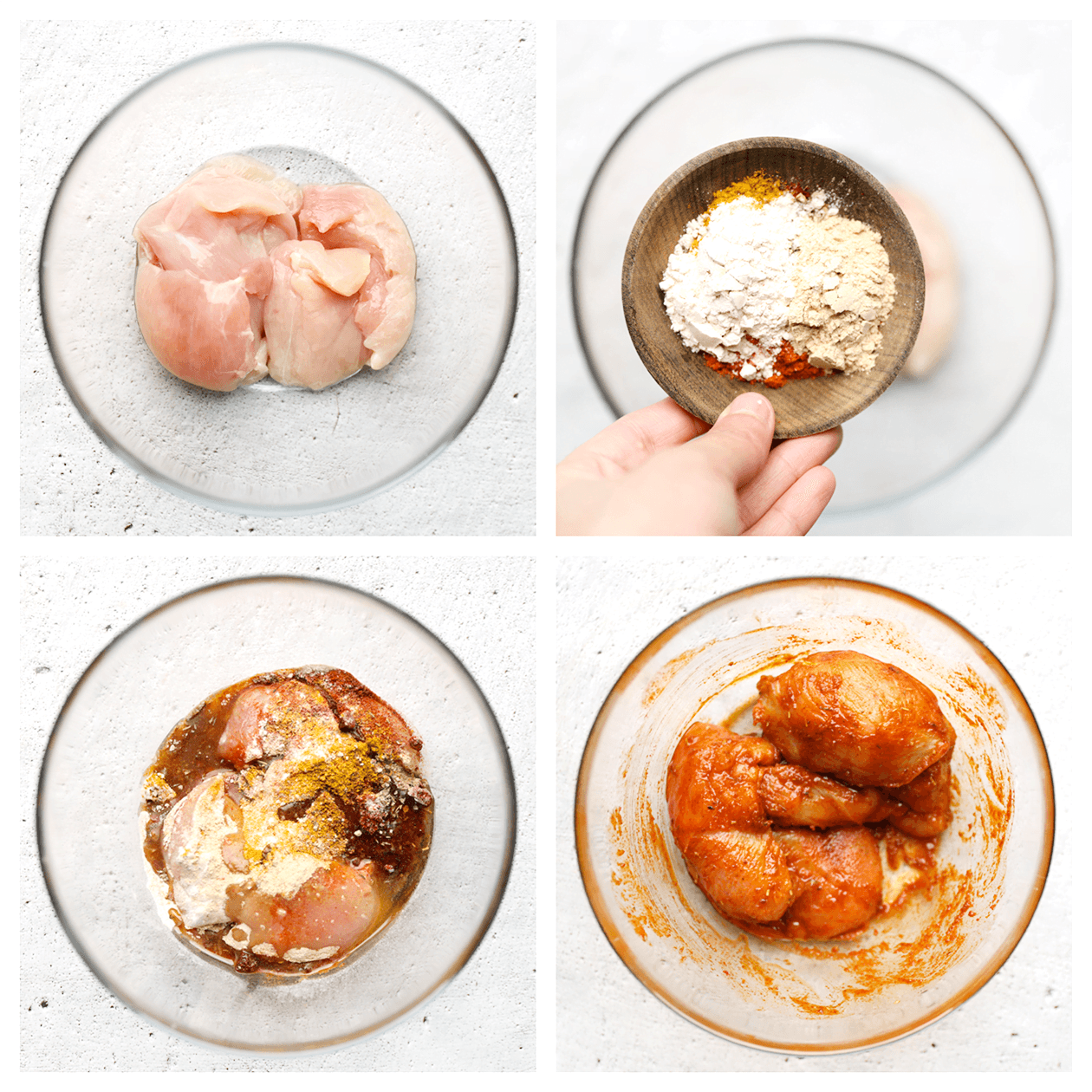 Was en snijd de kipfilet in grote stukken. Doe de kipfilet samen met de kipkruiden, paprikapoeder, cayennepeper, uienpoeder, knoflookpoeder, Italiaanse kruiden, currypoeder en olijfolie in een kom. Meng goed.