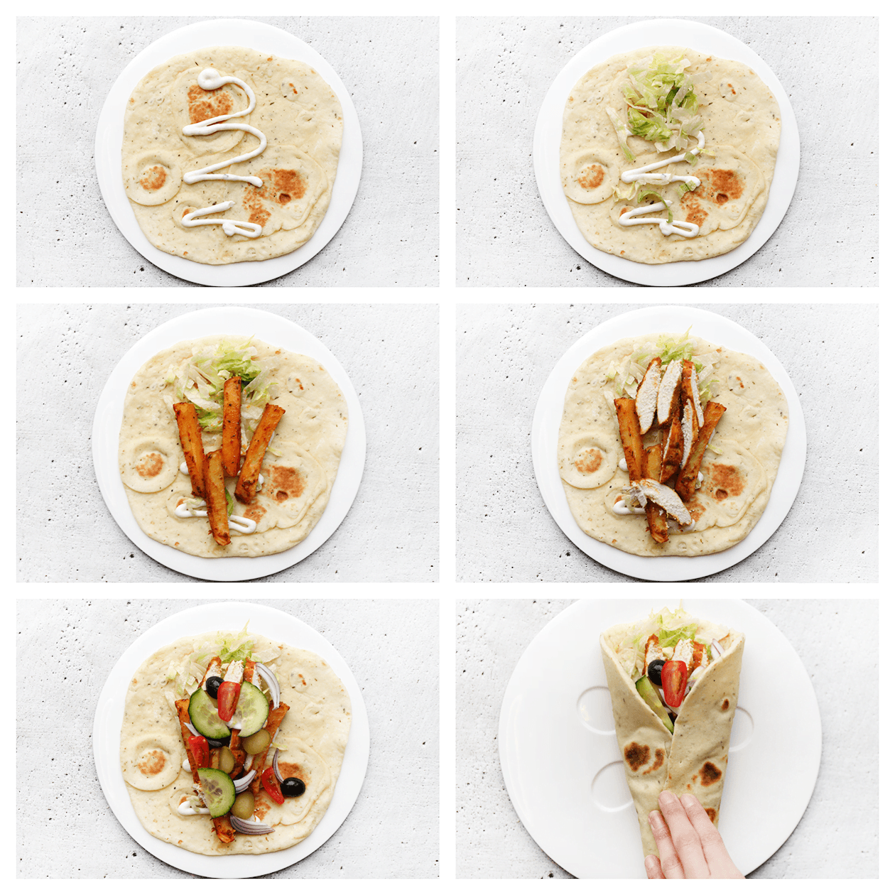 Neem een plat broodje. Vul het brood met saus, sla, friet, kip en frisse groenten naar wens. Vouw het dicht en geniet ervan!