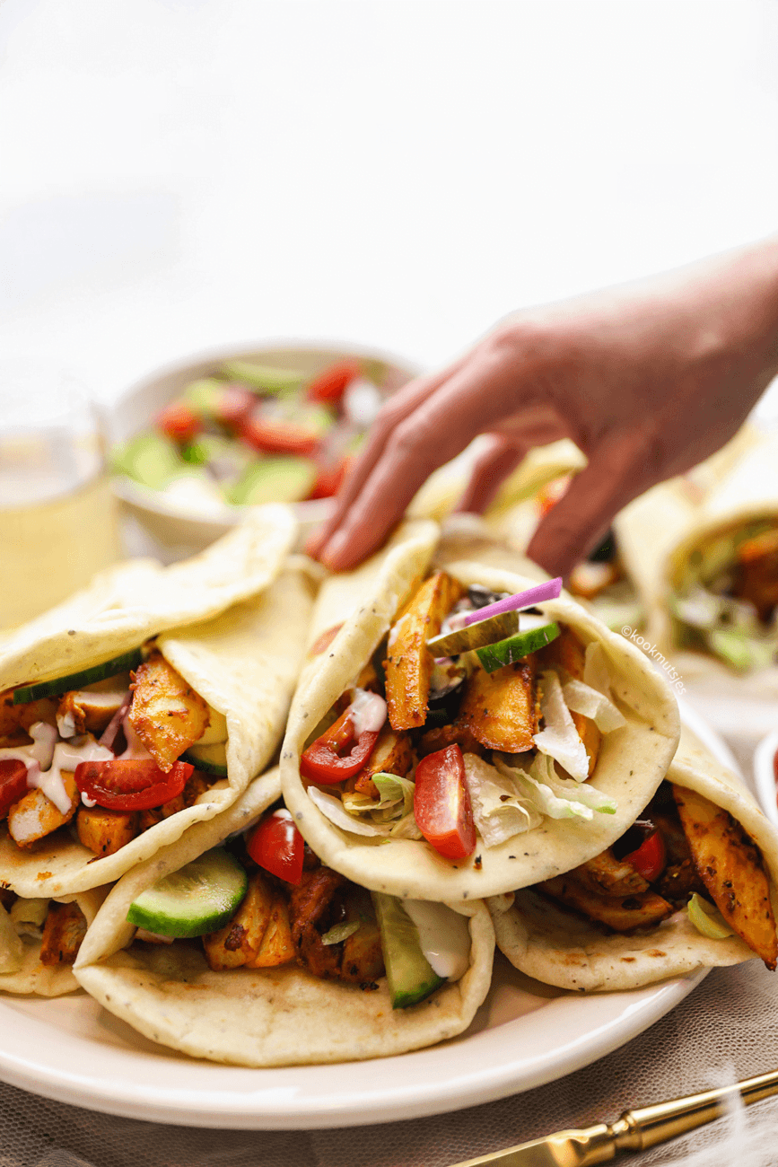 De combinatie van homemade platte broodjes gevuld met kip en friet uit de oven is niet alleen erg lekker, maar vult ook goed! Het deeg voor de platte broodjes is gemakkelijk te maken en zorgt voor een heerlijke basis! Een echte aanrader voor iedereen die van lekker eten houdt!
