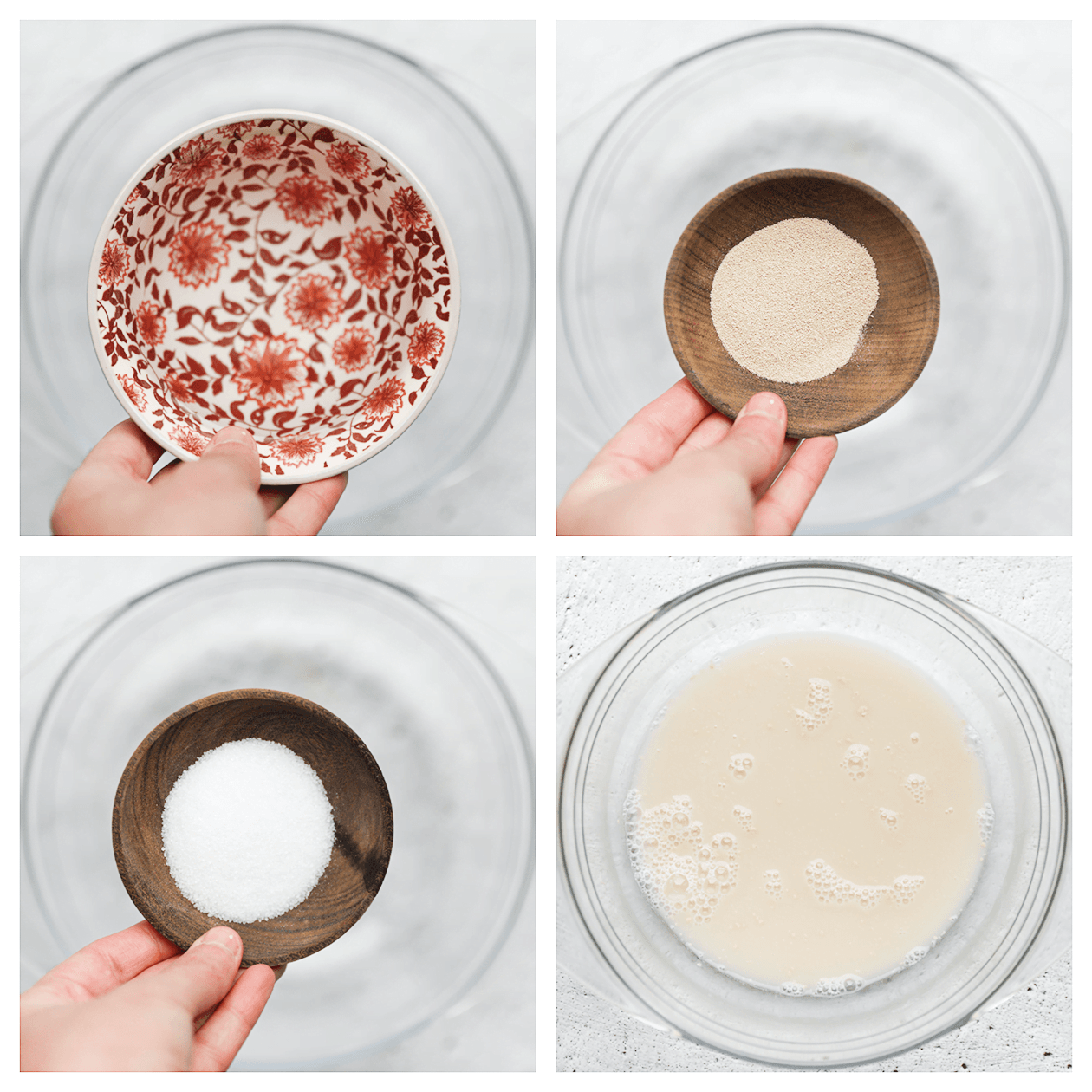Doe het lauwwarme water samen met de suiker en gist in een kom en meng goed. Laat het 5 minuten staan.