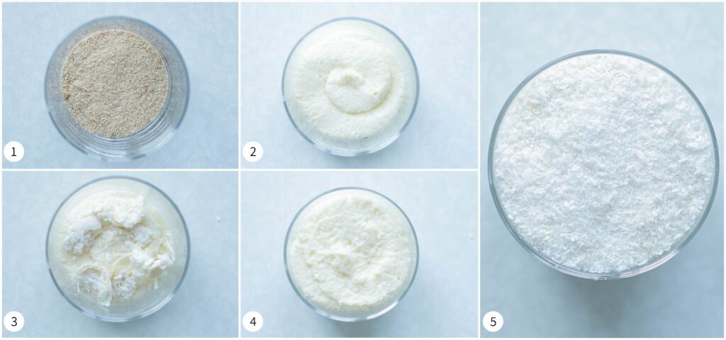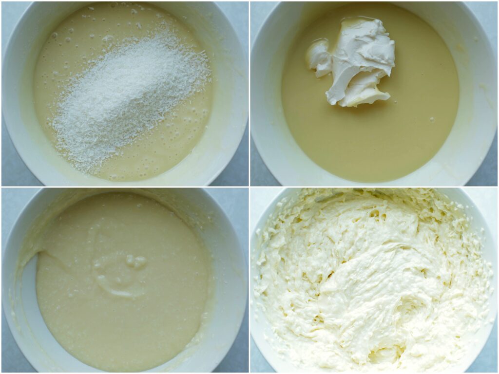 Voeg de mascarpone en geraspte kokos toe. Meng goed. Het kokosmengsel is nu erg vloeibaar! Leg het afgedekt in de koelkast voor een half uur om op te stijven. Haal het kokosmengsel uit de koelkast en mix het goed samen tot het stevige pieken vertoont (structuur van slagroom). Schep de room in een spuitzak. |