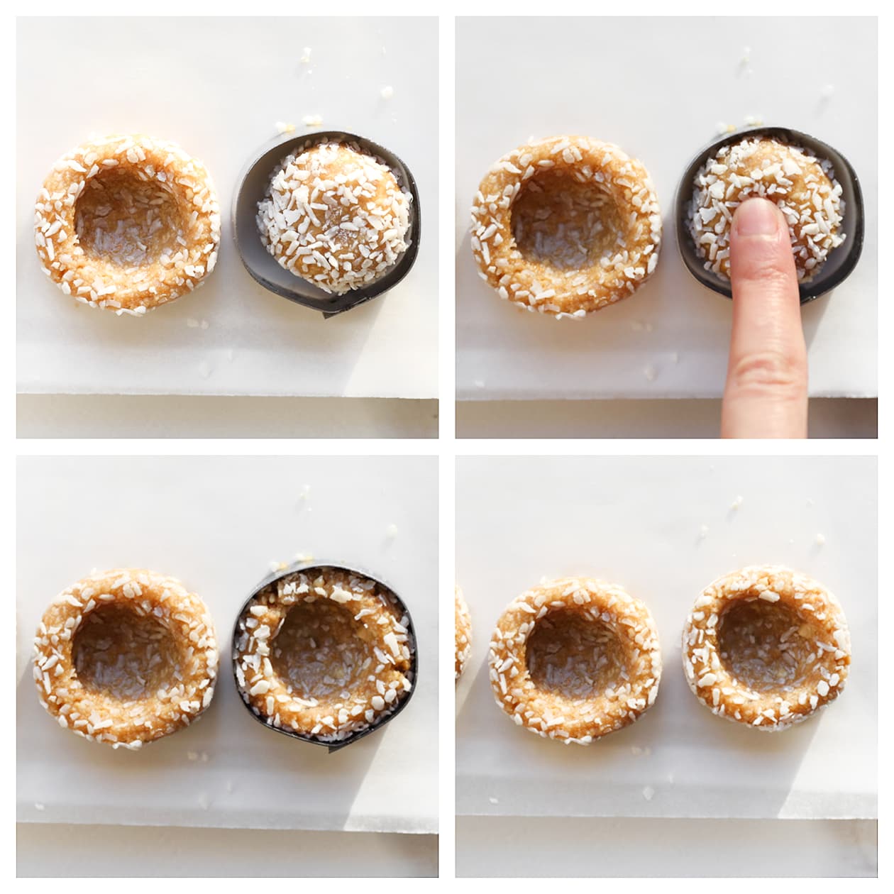 Avoid pressing too deeply into the cookies; the hole should be wide enough for the topping but not break the base.