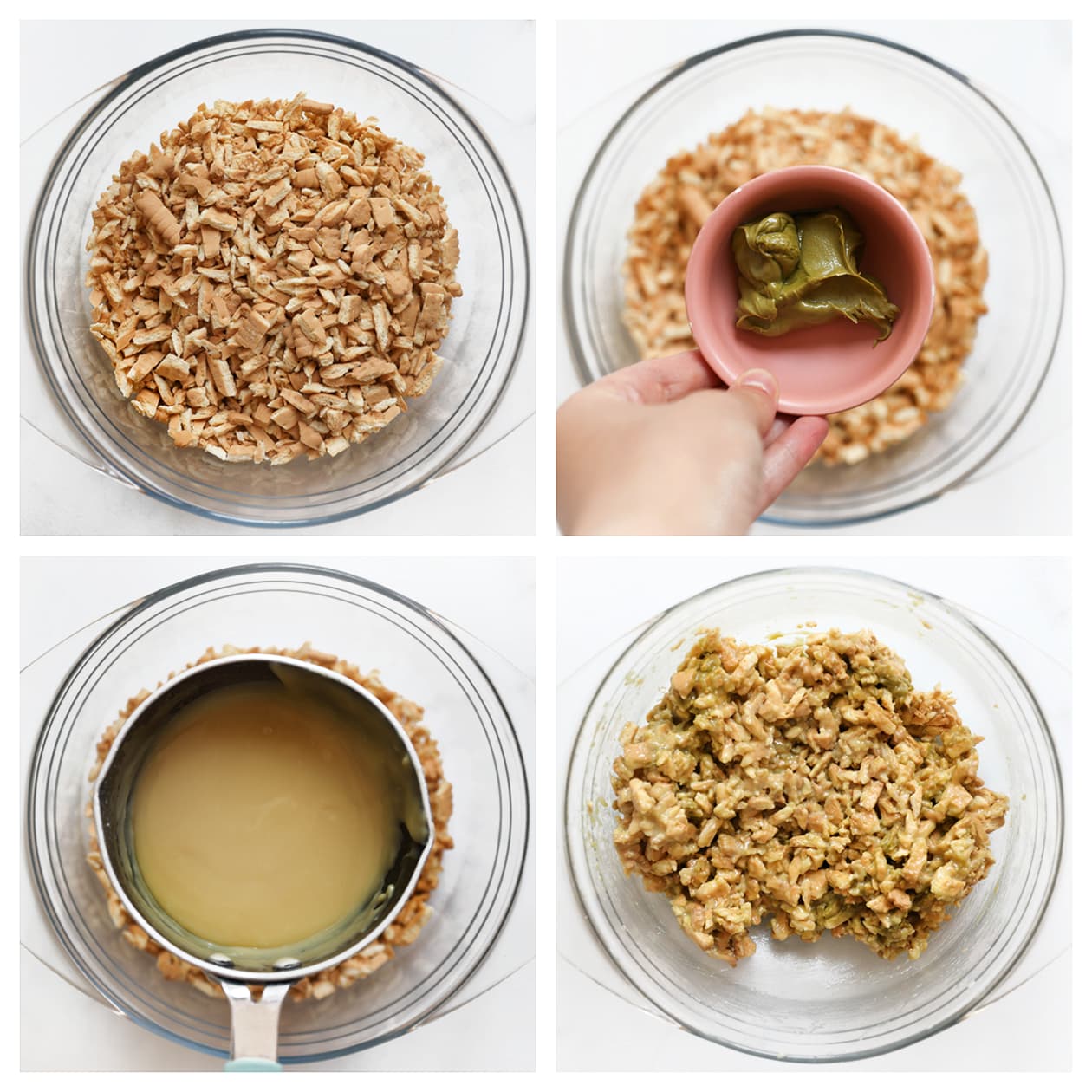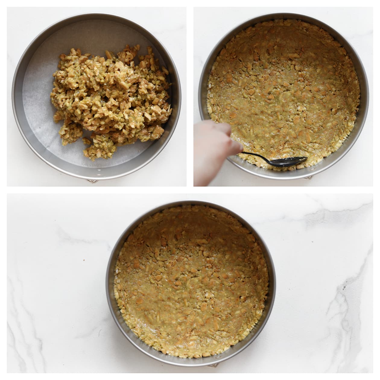 Use the bottom of a glass to press the crust firmly. This makes it neat and sturdy, so the cheesecake slices better.