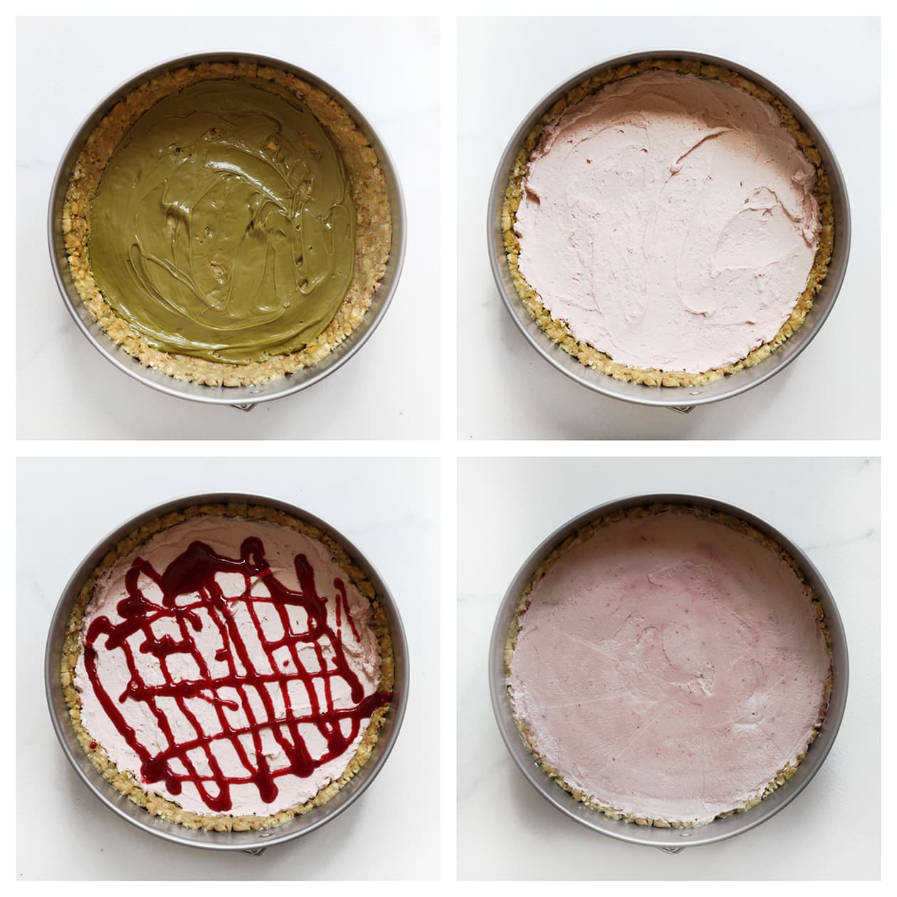 For a marble effect: pipe dots of raspberry syrup and pistachio paste on the topping and swirl with a skewer or toothpick.