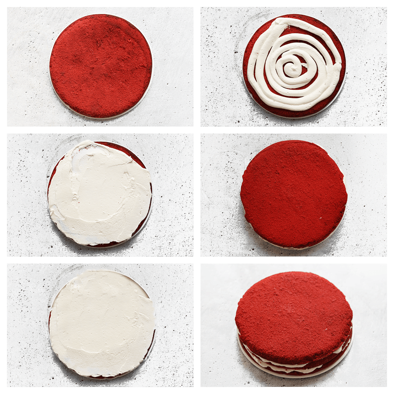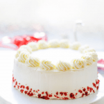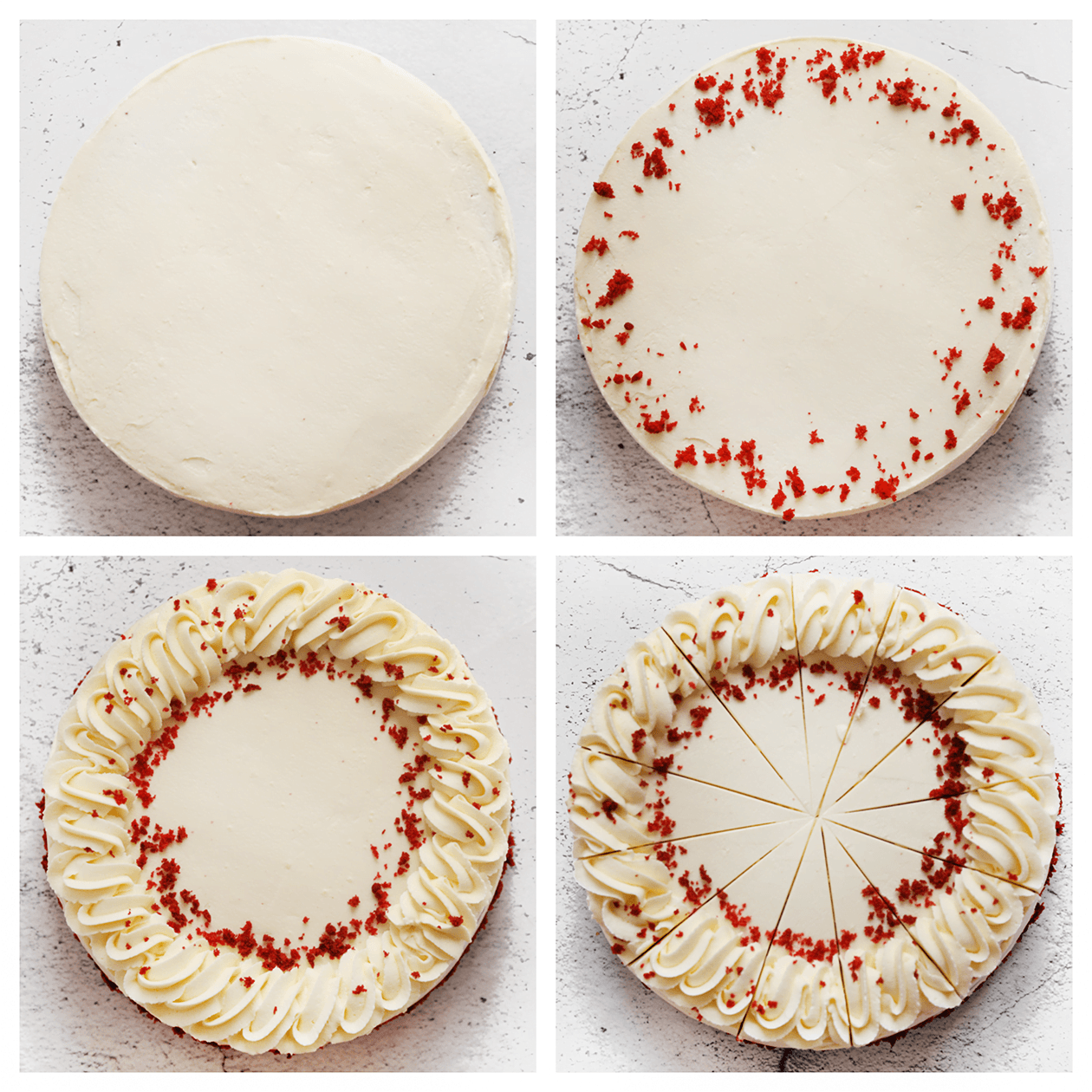 Zet de red velvet cake een nachtje in de koelkast zodat de smaken goed in kunnen trekken. Garneer de red velvet cake de volgende dag.