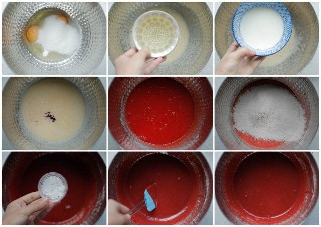 Breek de eieren boven een diepe kom. Voeg de suiker, vanillesuiker en het zout toe. Mix tot het lichtgeel kleurt. Voeg de zonnebloemolie toe en mix tot een geheel. Voeg de karnemelk en de kleurstofgel toe. Mix 30 seconden. Zeef de bloem en het cacaopoeder boven de kom. Mix tot een gladde massa. Doe de baking soda samen met de azijn in een kom. Meng goed en voeg dit toe aan het red velvet beslag. Spatel het mengsel goed door het beslag. |