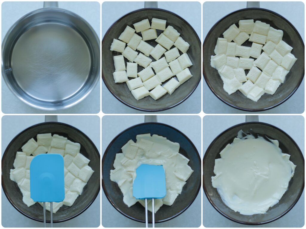 Smelt de witte chocolade au bain marie: |